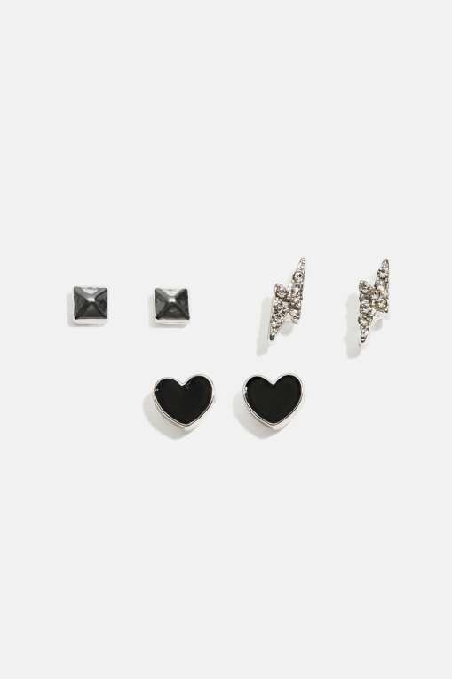 Pienet hopeanvärisestä metallista valmistetut nappikorvakorut, joissa erilainen muotoilu. Yksi pari pienillä niiteillä, yksi pari salamoilla ja strasseilla ja yksi pari mustilla sydämillä. Kolmen parin pakkaus.