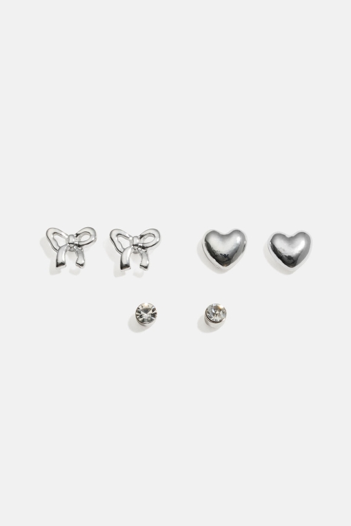 Pienet hopeanvärisestä metallista valmistetut nappikorvakorut, joissa erilainen muotoilu. Yksi pari ruseteilla, yksi pari sydämillä ja yksi pari lasikivillä.