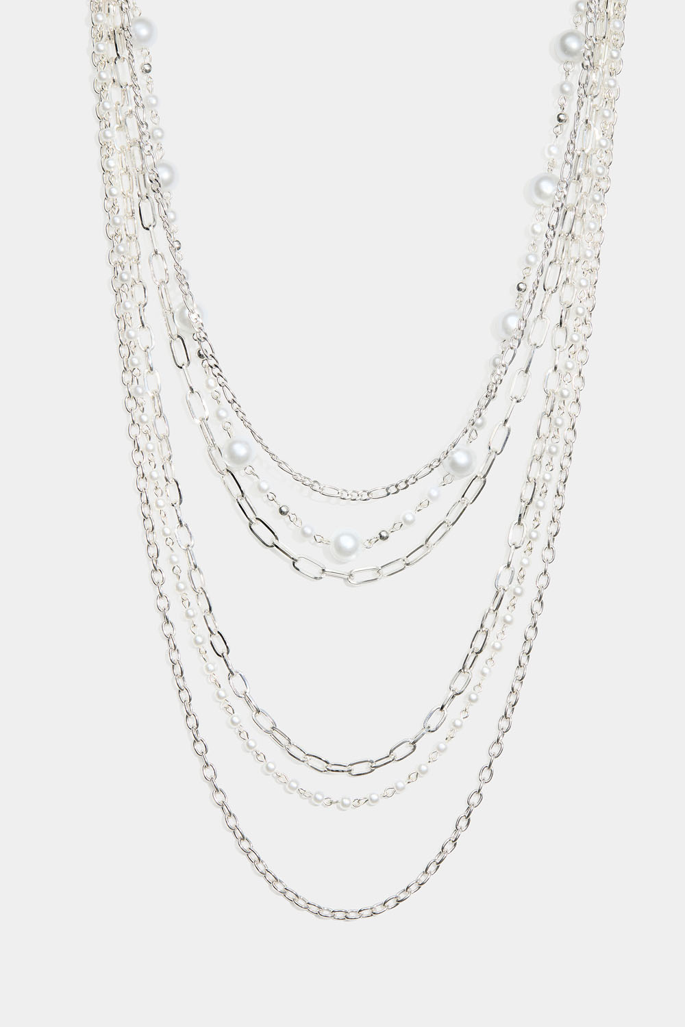 Pitkä kaulakoru, jossa on 6 erilaista ketjua, joista kaksi on koristeltu pyöreillä valkoisilla helmillä.
