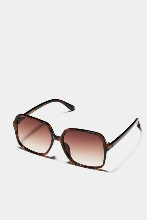 Ylisuuret aurinkolasit, joiden nelikulmainen muotoilu viittaa 1970-tyyliin. Aurinkolaseissa on ruskeat sävytetyt linssit ja kapeat kehykset, joissa on ruskea kilpikonnakuvio.