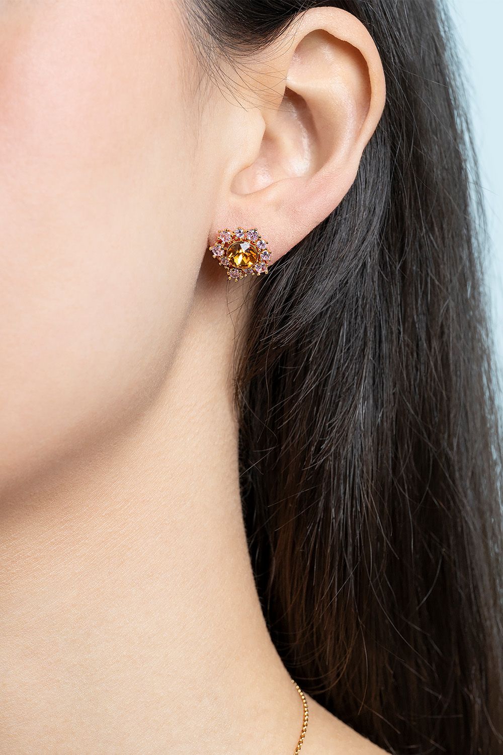 Valoa säteilevät Emily-korvakorumme luovat lumoavan ilmeen persikanvärisellä kivellä, jota täydentävät pienemmät vaaleanpunaiset kristallit. Kultaistutus tappilukolla. Täydennä tyyliäsi muilla Emily-mallistomme osilla.