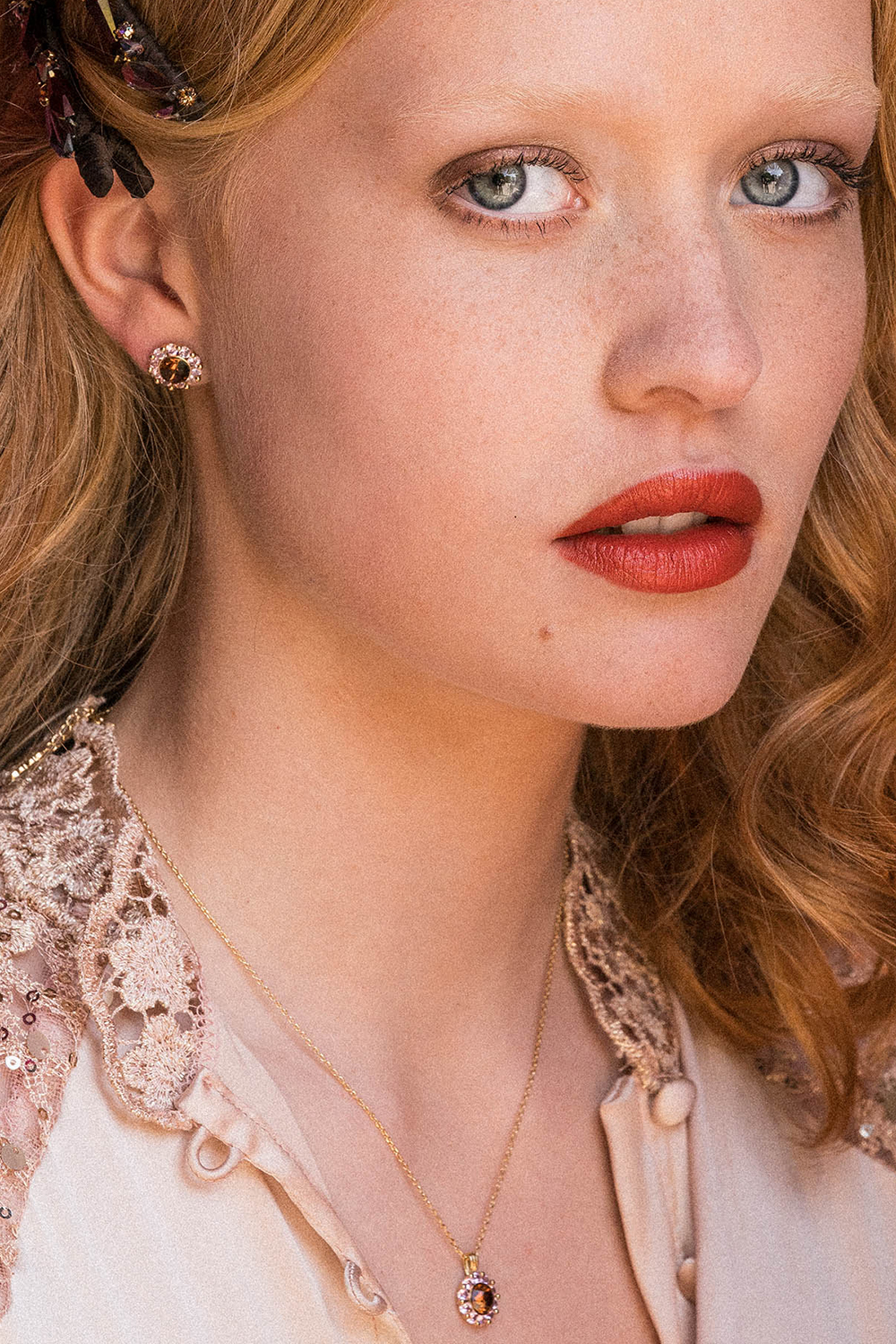 Hieno muotoilu tekee tästä kaulakorusta todella monipuolisen ja mihin tahansa tyyliin ja tilaisuuteen sopivan. Herkkä meripihkanvärinen Swarovski-kristalli on pienempien vaaleanpunaisten kivien ympäröimä. Täydennä tyylisi muilla New Sofia -sarjamme tuotteilla.