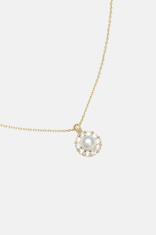 Hieno muotoilu tekee tästä kaulakorusta todella monipuolisen ja mihin tahansa tyyliin ja tilaisuuteen sopivan. Tässä korussa on herkkä utuinen helmi keskikivenä, jota kehystävät pienemmät kirkkaat kristallit, istutettuna kultaketjuun. Välitön suosikki.