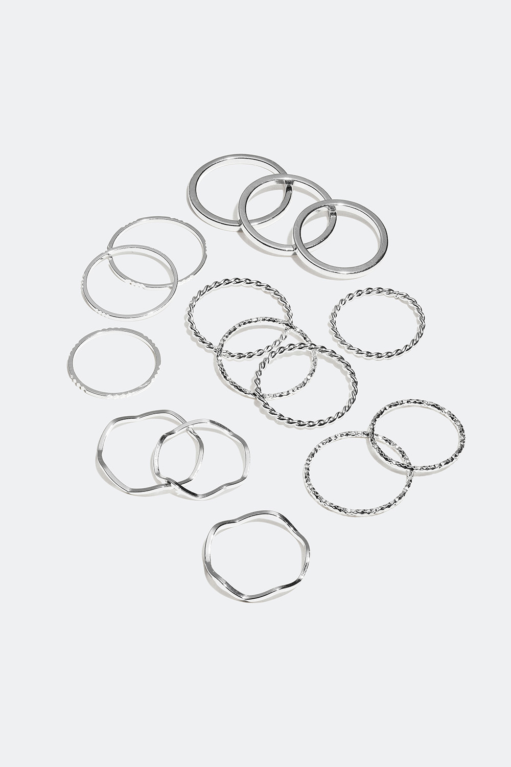 15-pakkaus ohuita metallisormuksia, joissa on eri muotoiluja ja yhdistelmä erilaisia kokoja, jotta sormuksia voi käyttää samanaikaisesti eri sormissa. Pakkauksessa on yhdistelmä sormuksia koossa 16/17/18 tai 18/19/20. Täydellinen sekoitus sormuksia, joissa on sileä, aaltoileva, kierretty ja kuviollinen muotoilu.