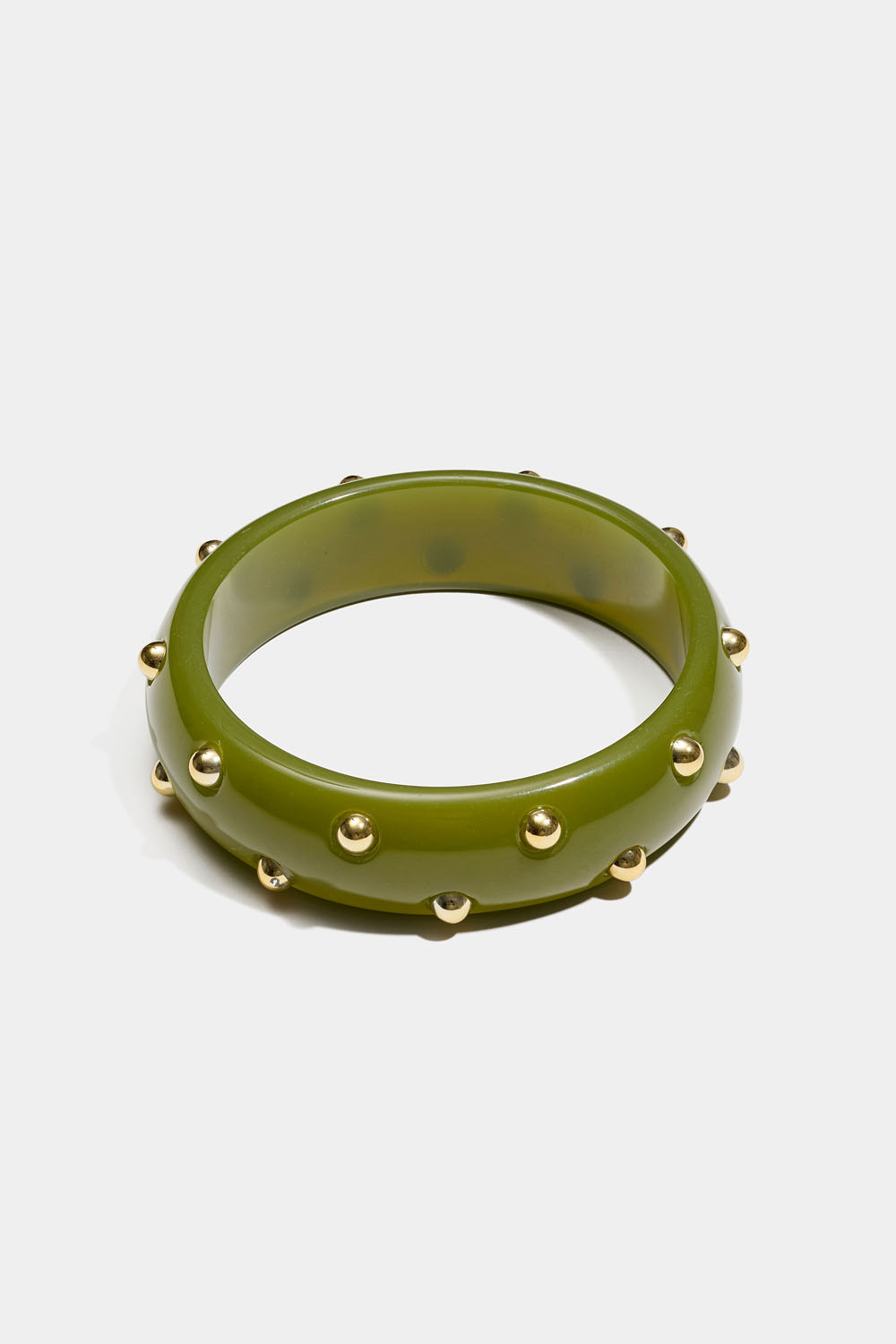 Leveä oliivinvärinen akryylinen rannerengas, jossa on pyöreitä kullanvärisiä niittejä.