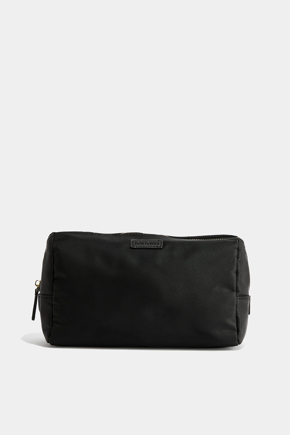 Musta, suurempi toalettilaukku kevyestä kankaasta, jossa on keinonahkaisia yksityiskohtia. Se suljetaan kullanvärisellä vetoketjulla, ja siinä on pieni sisäosasto, joka suljetaan vetoketjulla.
