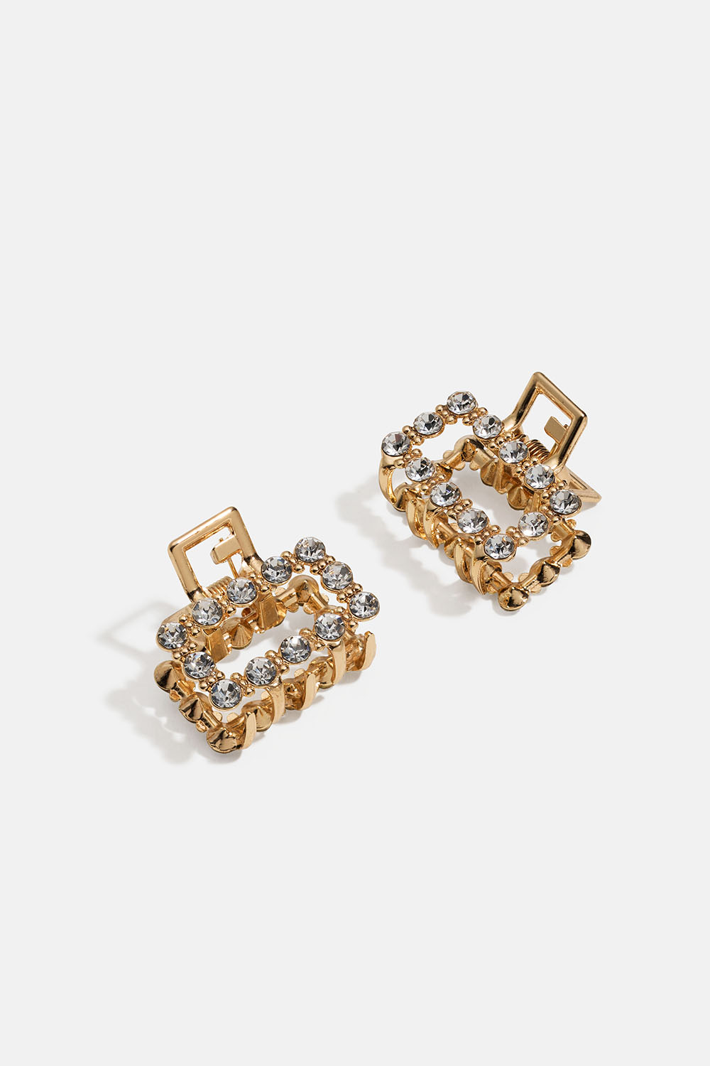 Kaksi pientä kullanväristä hiusklipsiä, joissa valkoisia lasikiviä