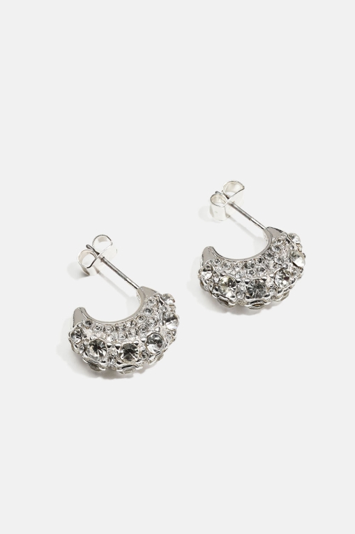 Pienet hopeanväriset metallikorvarenkaat, jotka on koristeltu monen kokoisilla valkoisilla lasikivillä.
