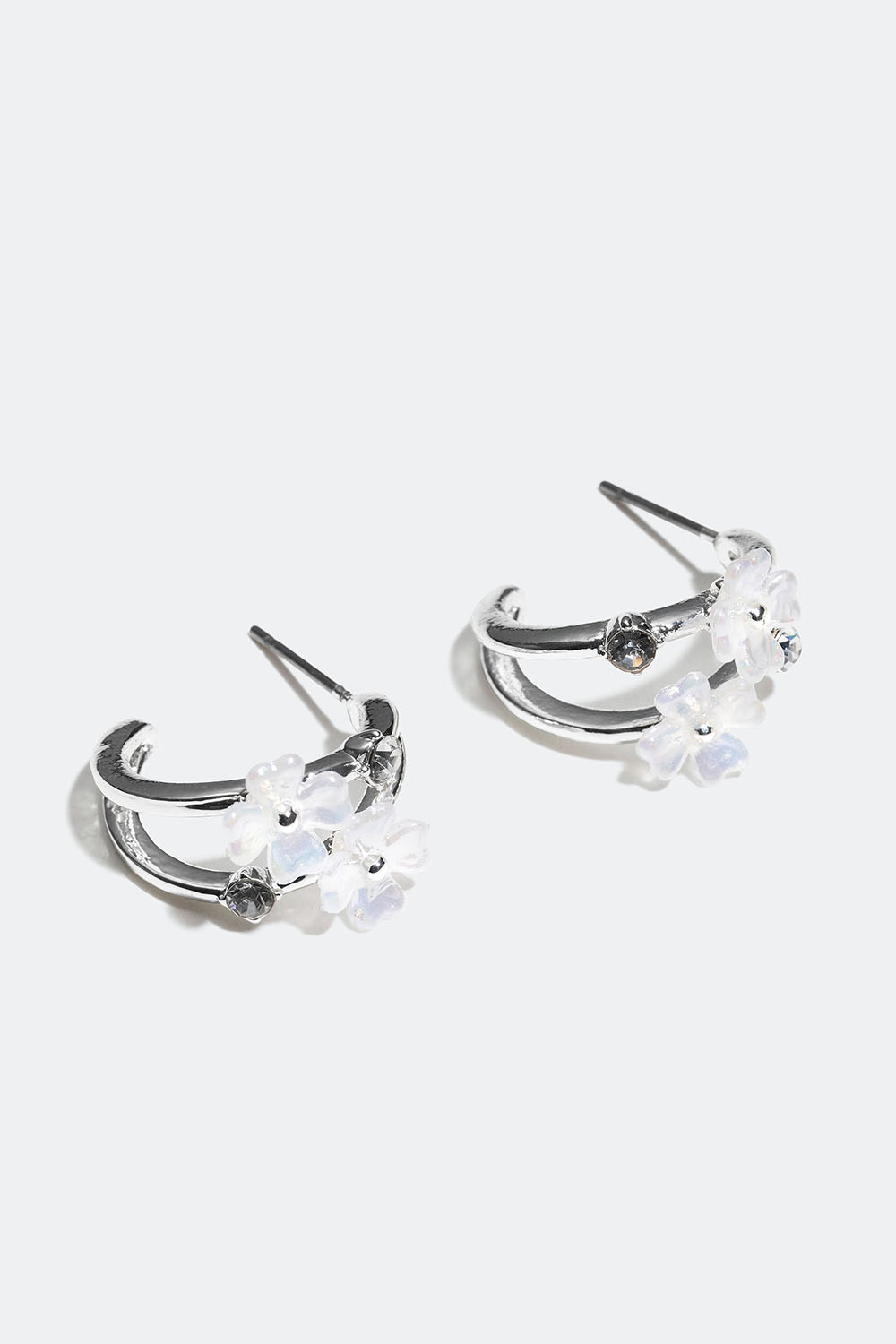 Pienet kaksinkertaiset korvarenkaat, jotka on koristeltu pienillä valkoisilla kukilla ja lasikivillä.