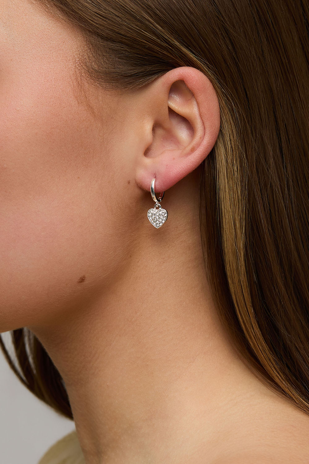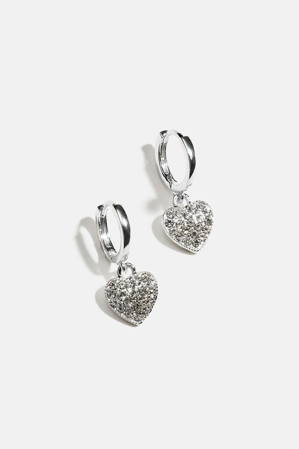 Pienet korvarenkaat, joissa on kimaltavilla lasikivillä koristeltuja sydänriipuksia.