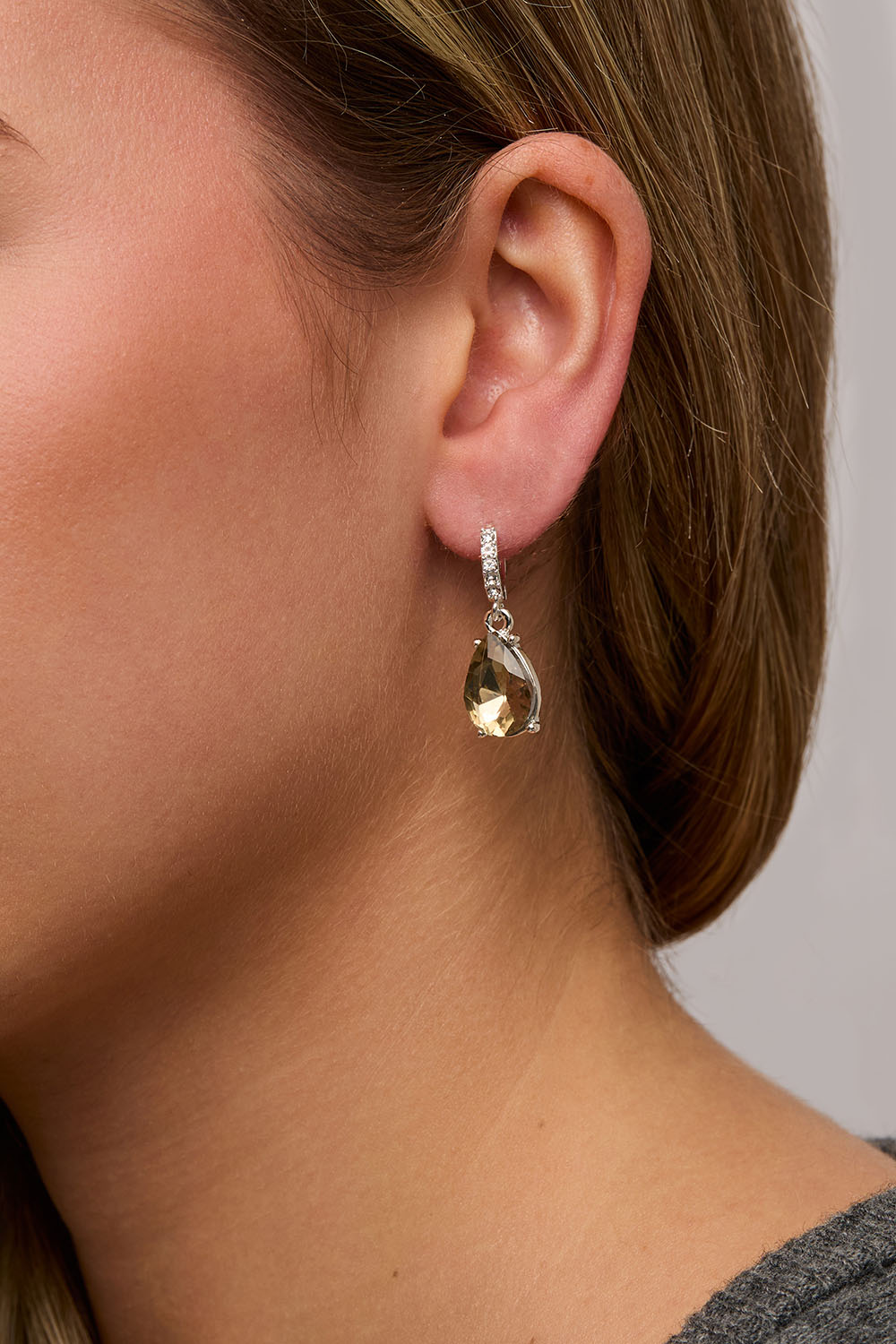 Pienet korvarenkaat hopeanväristä metallia, koristeltu pienillä valkoisilla lasikivillä ja suurella roikkuvalla vaaleanruskealla pisaranmuotoisella lasikivellä.