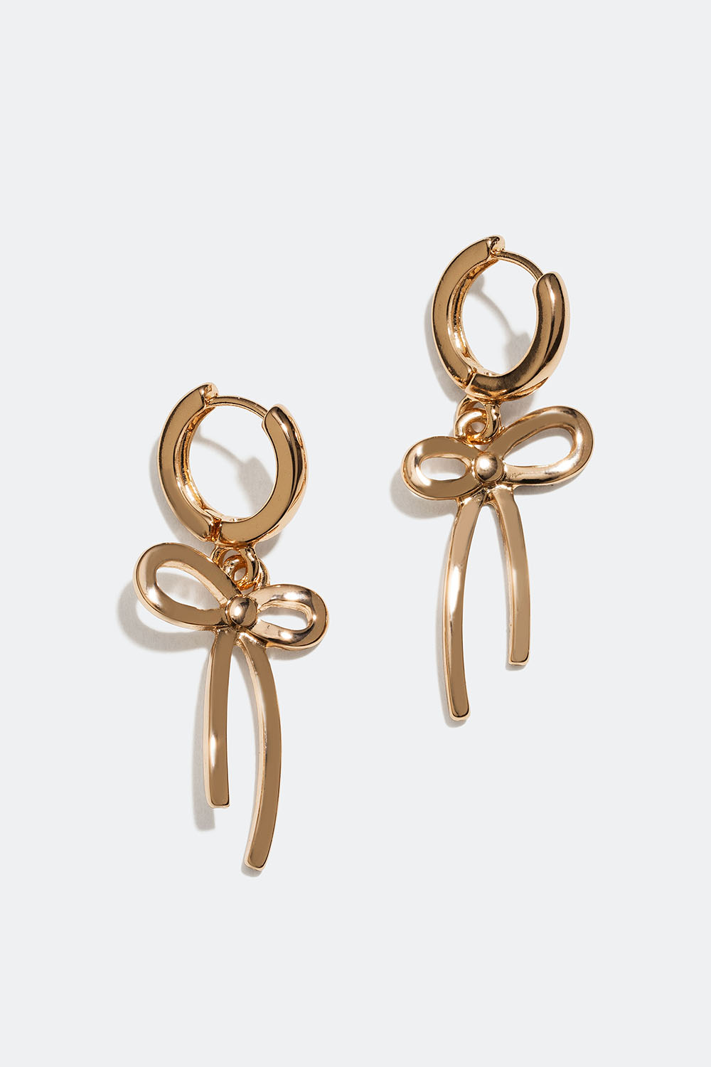 Sileät, pienet kullanvärisestä metallista valmistetut korvarenkaat, joissa koristeelliset rusettiriipukset.