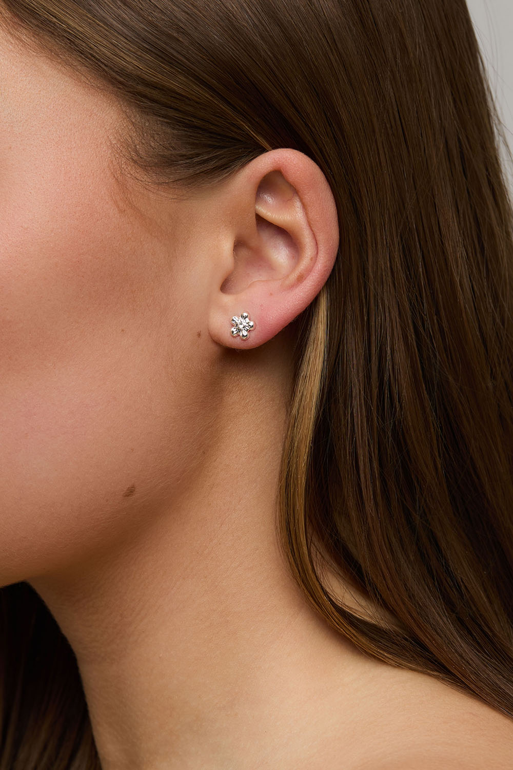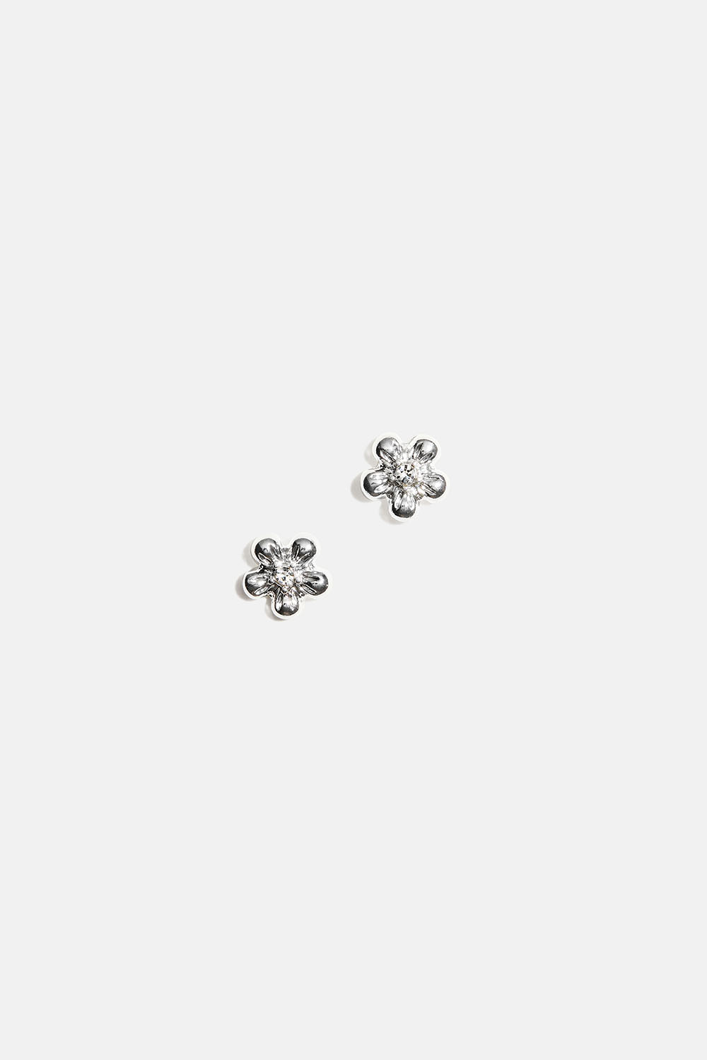 Pienet metalliset nappikorvakorut, jotka ovat kukan muotoiset ja joiden keskellä on kimaltavat lasikivet.