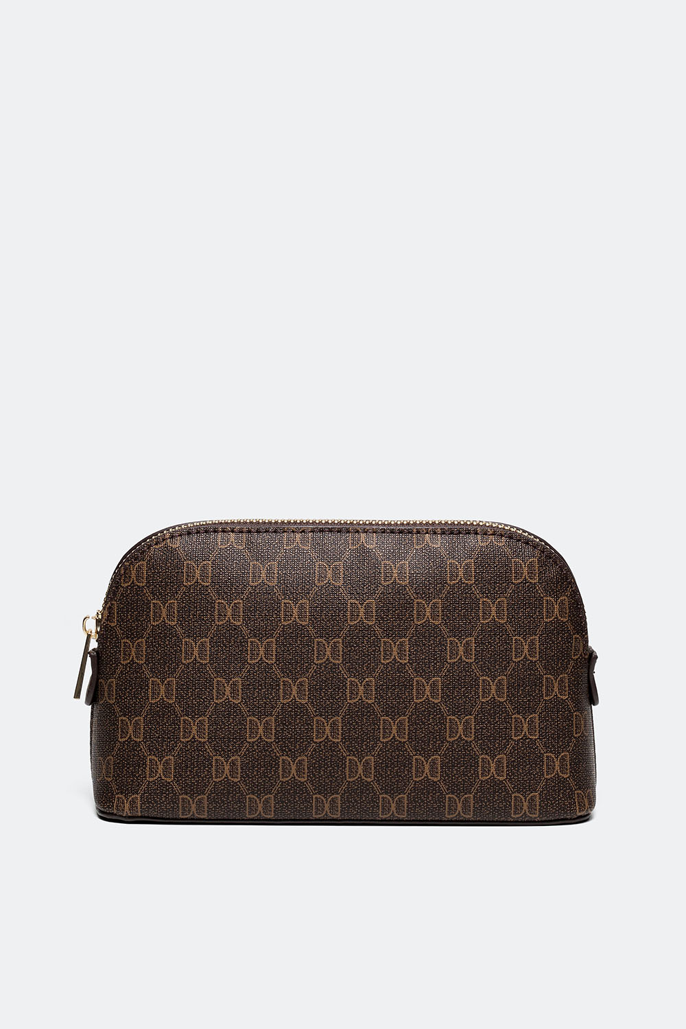 Pieni ruskea toalettilaukku painetulla Don Donna -logolla. Täydellisen kokoinen esimerkiksi meikkien tai muiden hygieniatuotteiden säilyttämiseen.