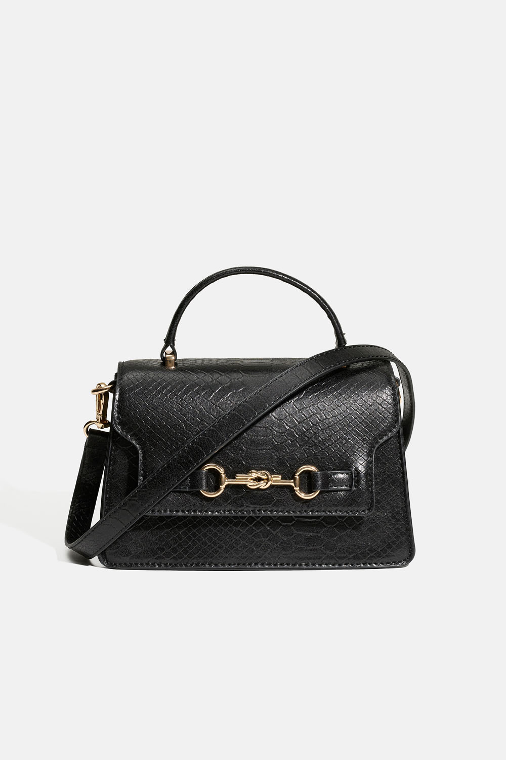 Pieni musta laukku käärmeennahkakuvioinnilla ja kullanvärisellä metallinapilla. Laukku voidaan sulkea magneettinapilla, ja siinä on kolme sisätaskua, jotka voi sulkea vetoketjulla. Mukana säädettävä olkahihna.
