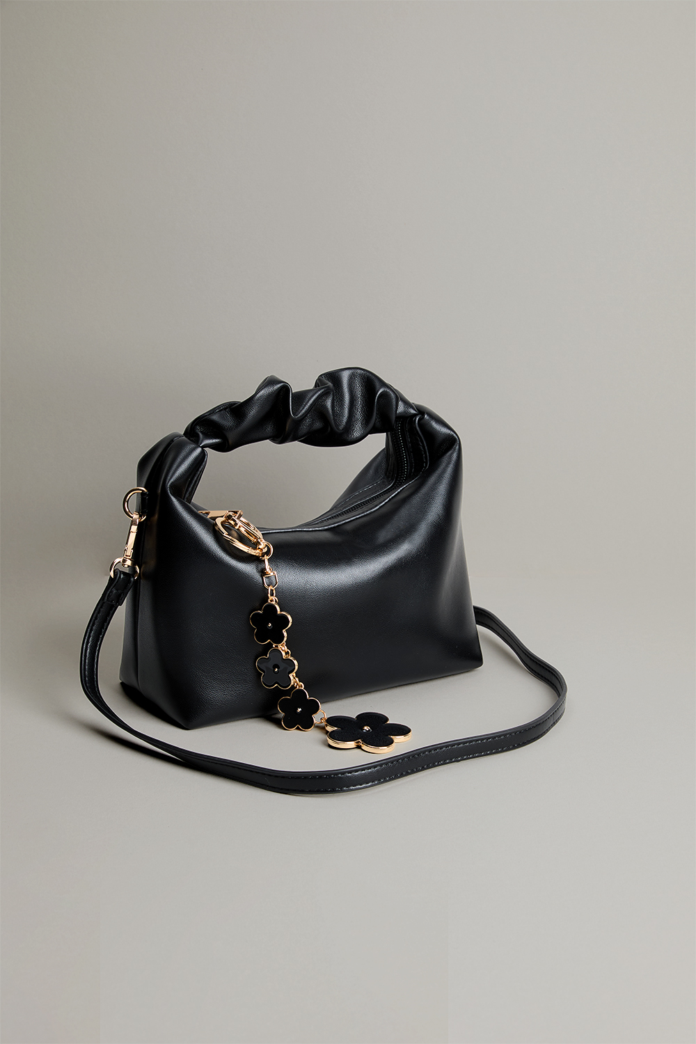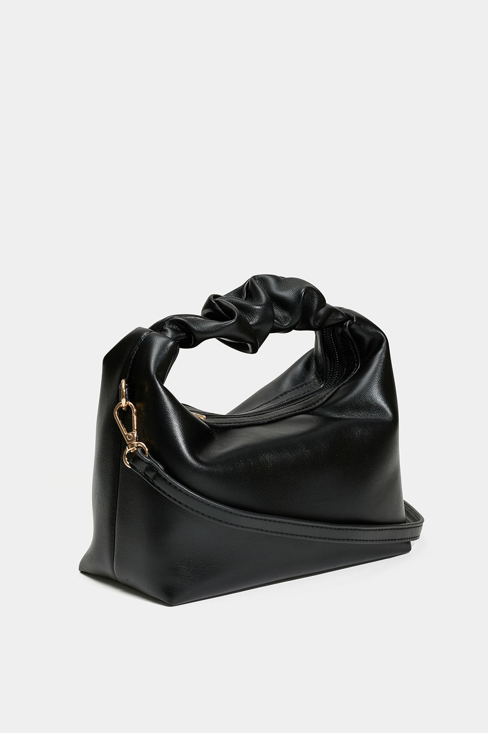 Pieni musta laukku, jossa on ryppyinen kantokahva