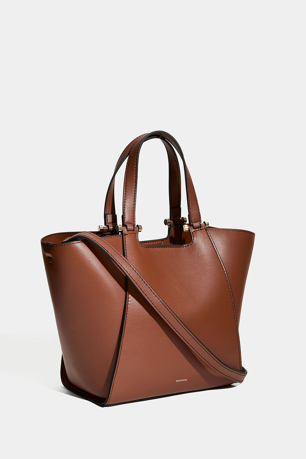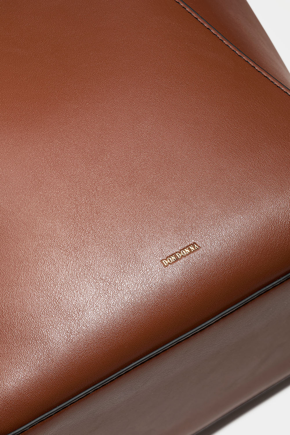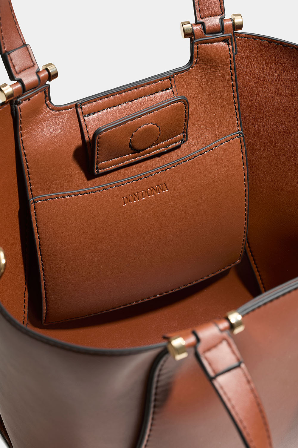 Pieni ruskea Don donna -ostoskassi keinonahasta. Tyylikäs laukku, jossa on kaksi ohutta kahvaa ja irrotettava pidempi olkahihna. Laukussa on suuri lokero, joten voit halutessasi napittaa laukun sivuilta kapeammaksi.