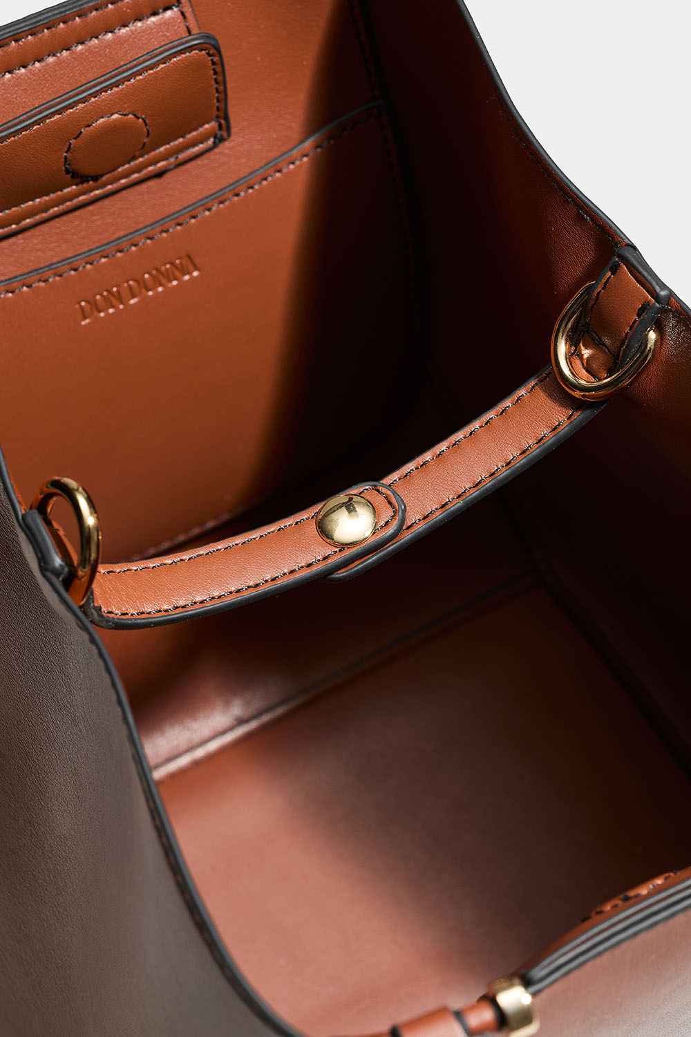 Pieni ruskea laukku, jossa on kaksinkertainen olkahihna