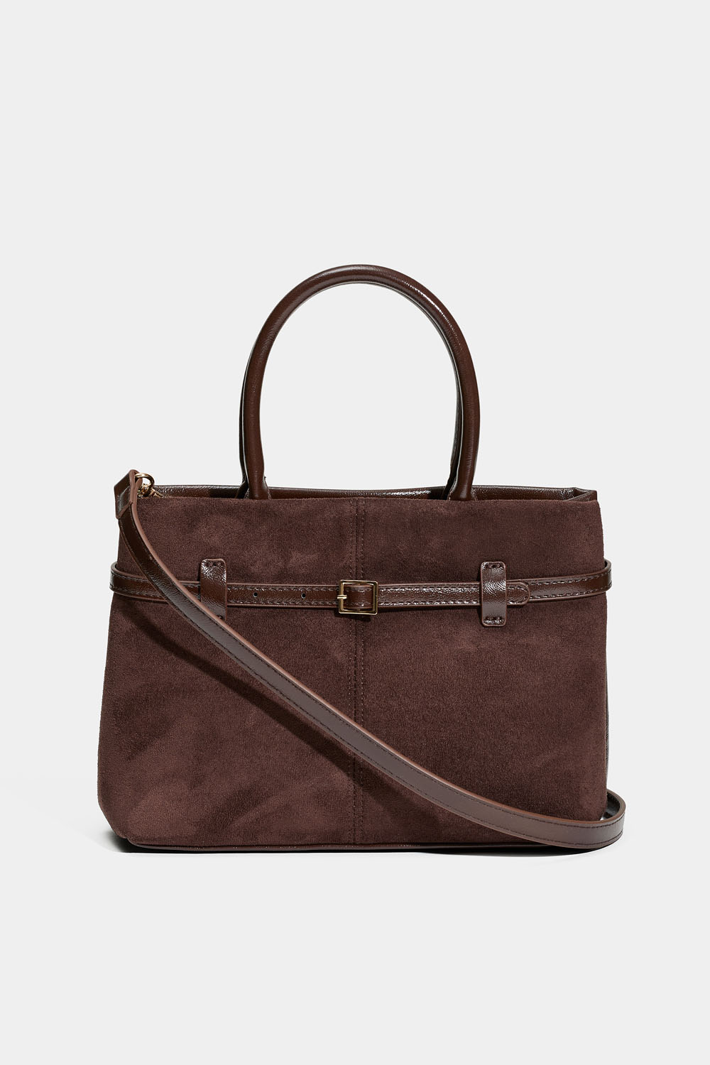 Pieni ruskea suorakaiteen muotoinen laukku keinomokkaa- ja nahkaa, jonka ympärillä on kapea vyö. Laukussa on yksi suurempi magneetilla suljettava tasku ja sisällä pienempi tasku, jossa on vetoketju. Mukana säädettävä olkahihna.