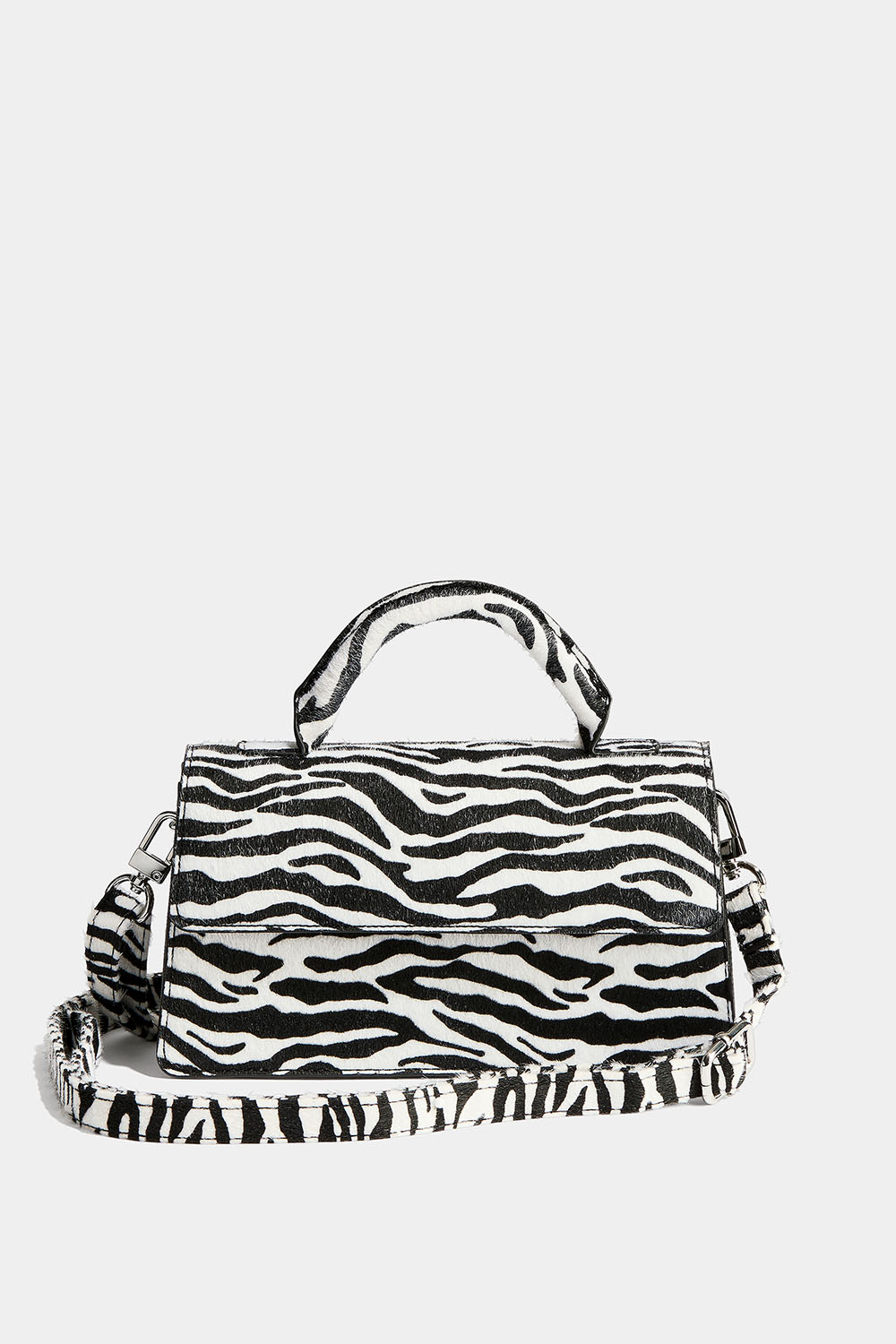 Suorakulmainen seeprakuvioisesta tekoturkiksesta valmistettu käsilaukku, jossa on säädettävä olkahihna ja pyöristetty kahva. Laukun sisällä on yksi suuri ja yksi pieni tasku, joista toinen on vetoketjullinen.