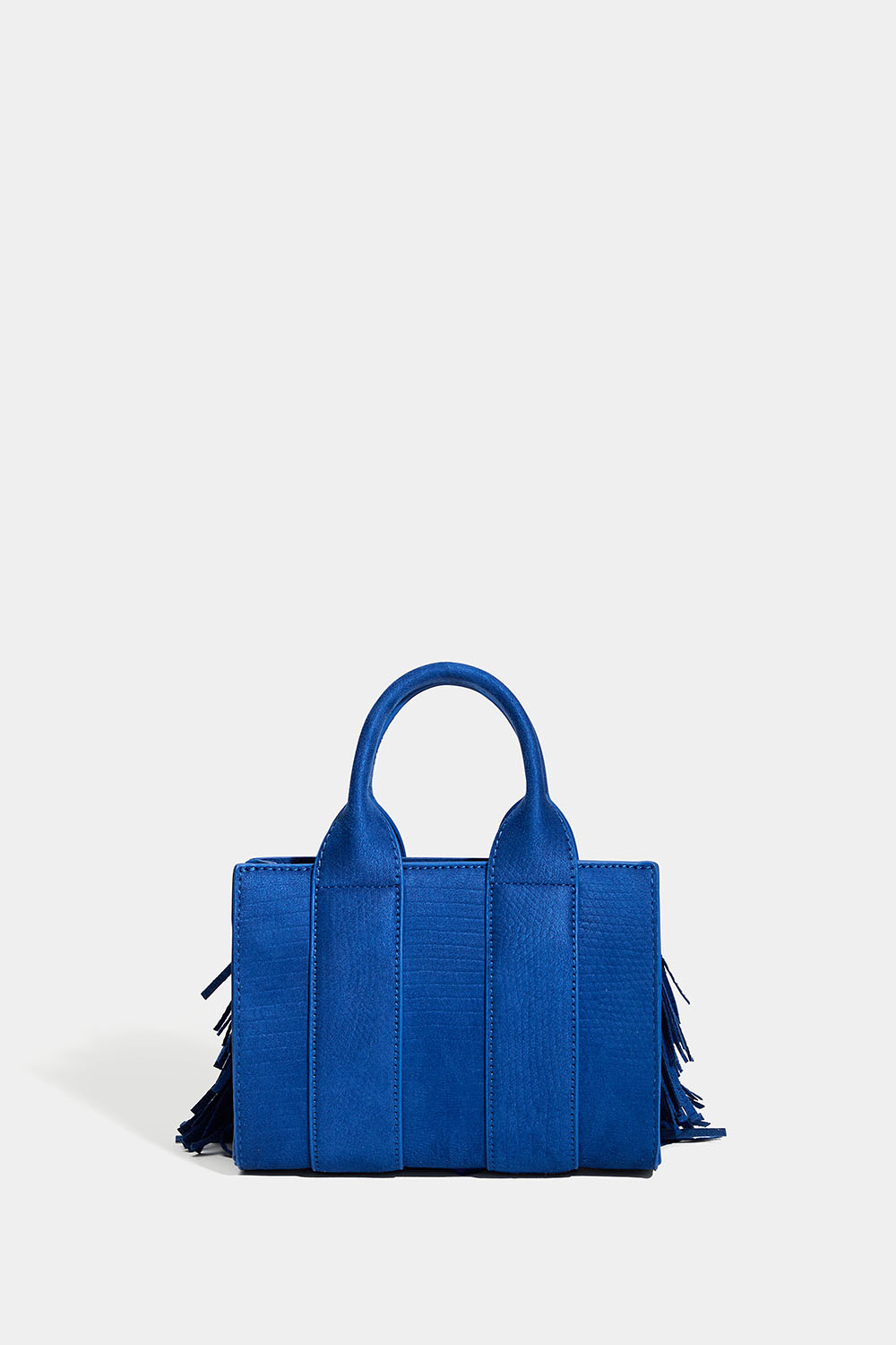 Pieni sininen laukku, jossa on kaksi kahvaa, mokkanahkahapsut ja hienovarainen käärmeennahkakuvio. Laukussa on myös irrotettava olkahihna, joten voit käyttää laukkua olkapäällä tai crossbody-tyyliin.