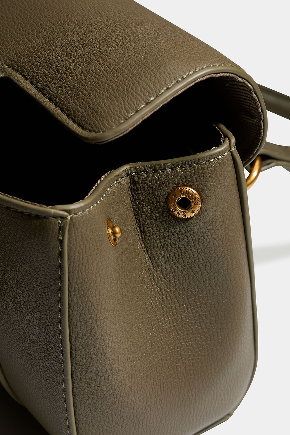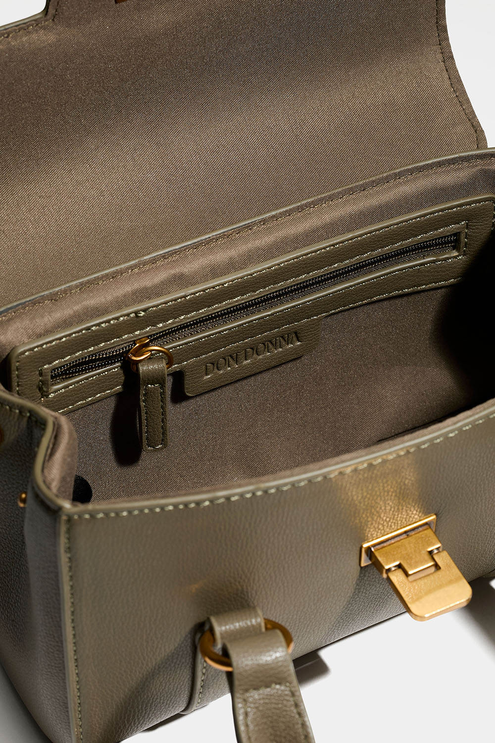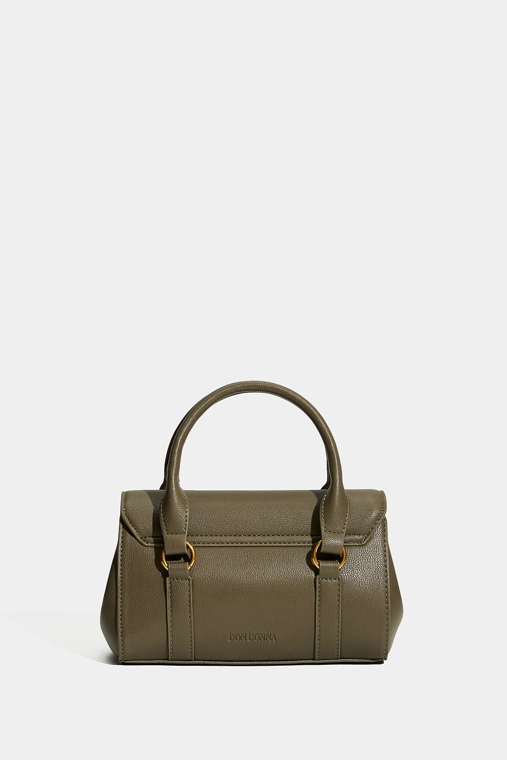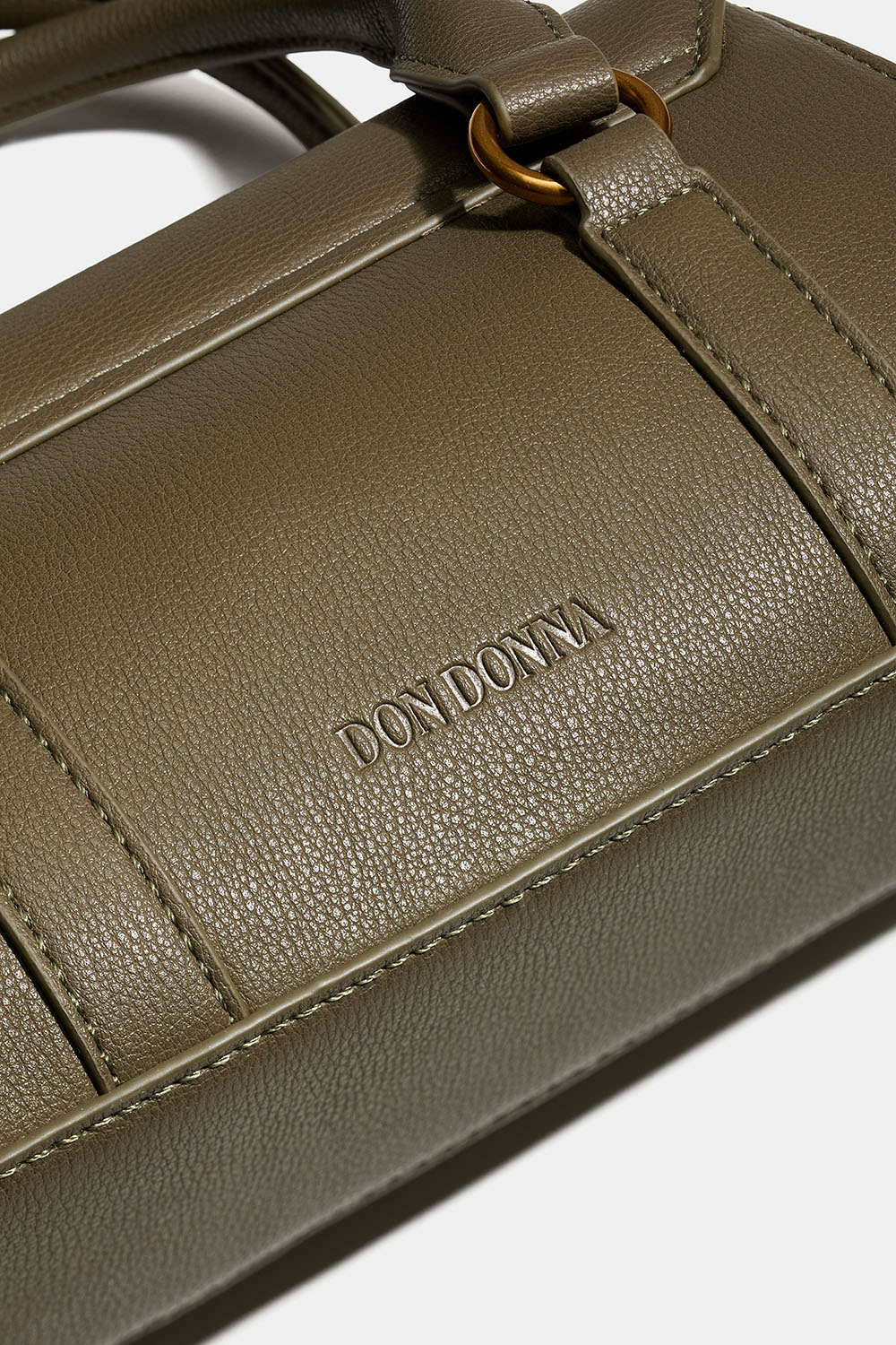 Pieni vihreä Don Donnan tekonahkainen käsilaukku, jossa on Don Donna-logo kohokuvioituna takana ja mattapintaisia kullanvärisiä metalliosia. Laukussa on myös pidempi olkahihna, joten voit käyttää laukkua myös ristiin.