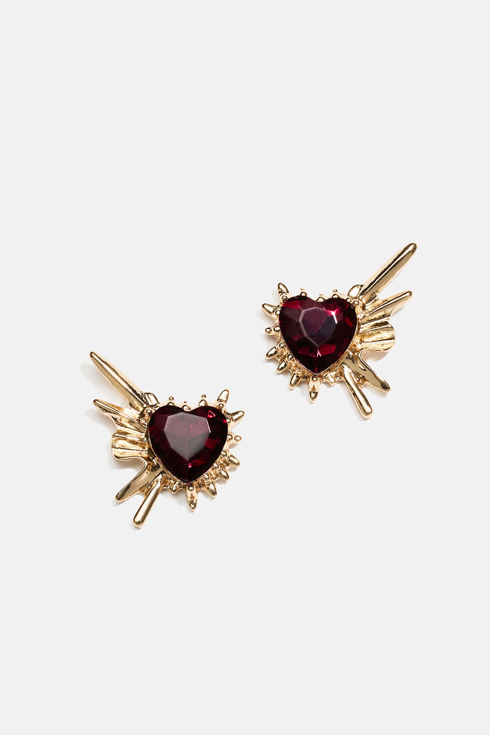 Nappikorvakorut piikikkäillä yksityiskohdilla ja viininpunaisilla sydämenmuotoisilla lasikivillä.