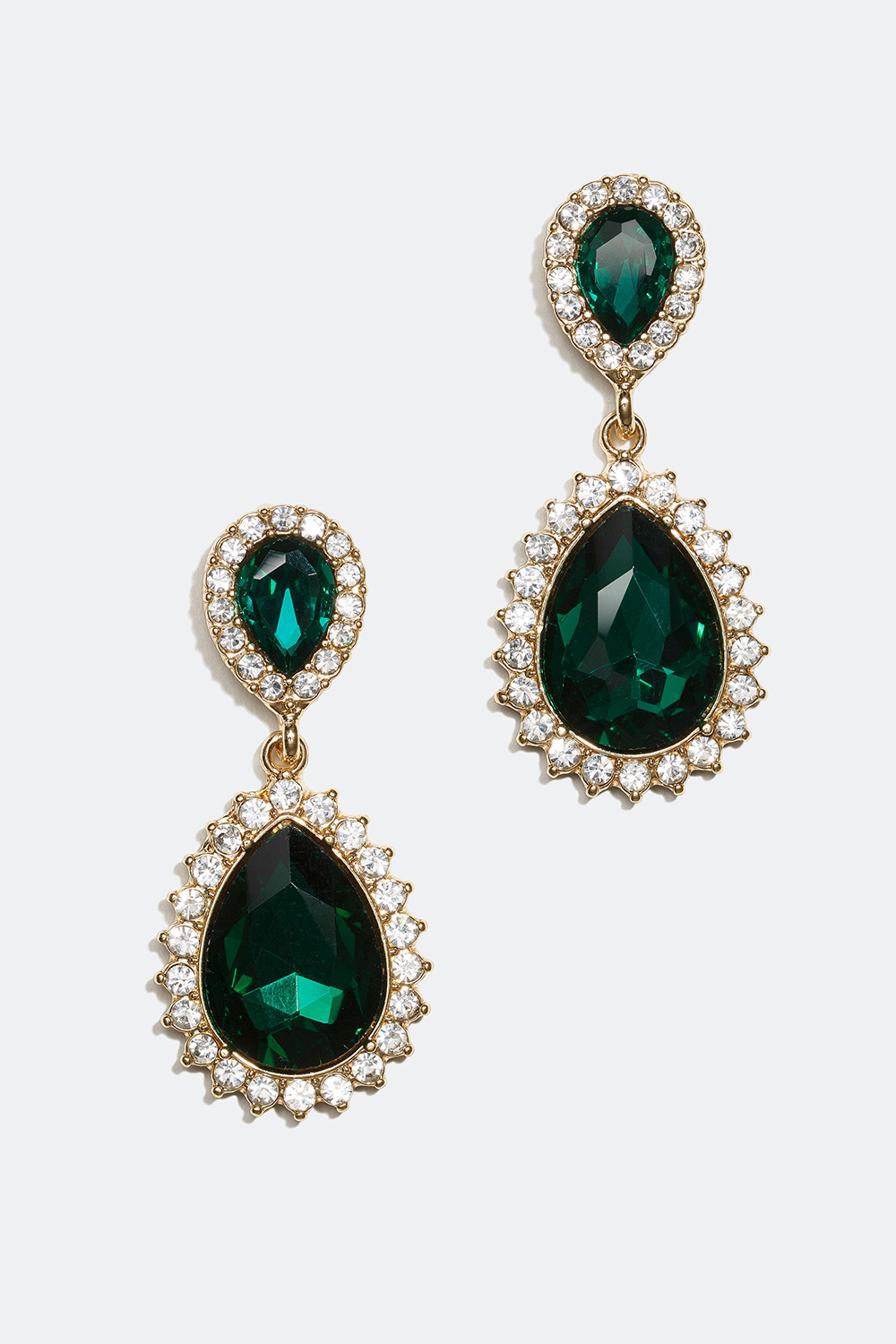 Suuret pisaranmuotoiset korvakorut kullanväristä metallia. Kaksi isoa vihreää lasikiveä ja ympärillä useita pieniä lasikiviä. Oikeat statement-korvakorut, jotka tuovat hohtoa ja glamouria asuusi. Täydelliset juhlatilaisuuksiin, kun haluat erottua joukosta.