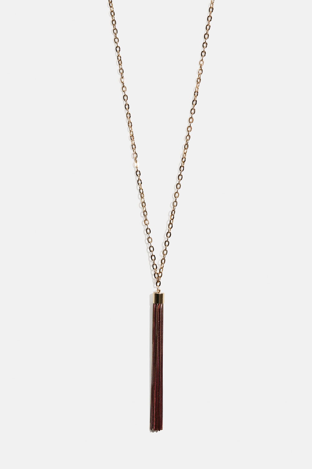 Pitkä kullanvärisestä metallista valmistettu kaulaketju, jossa on punainen tupsuriipus.