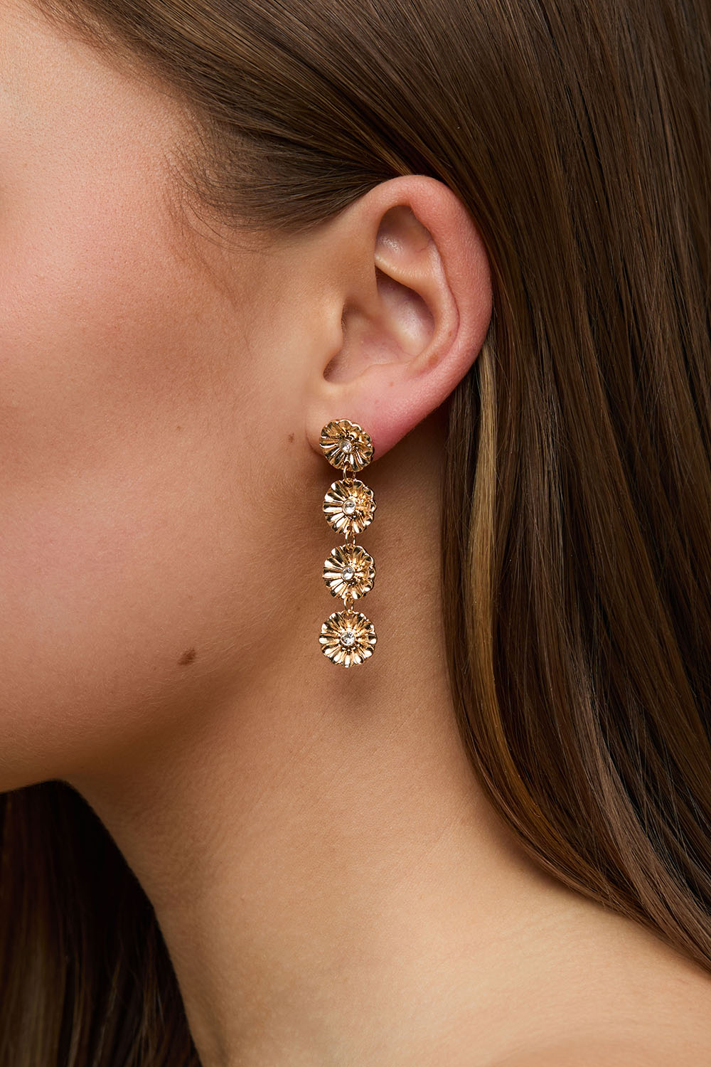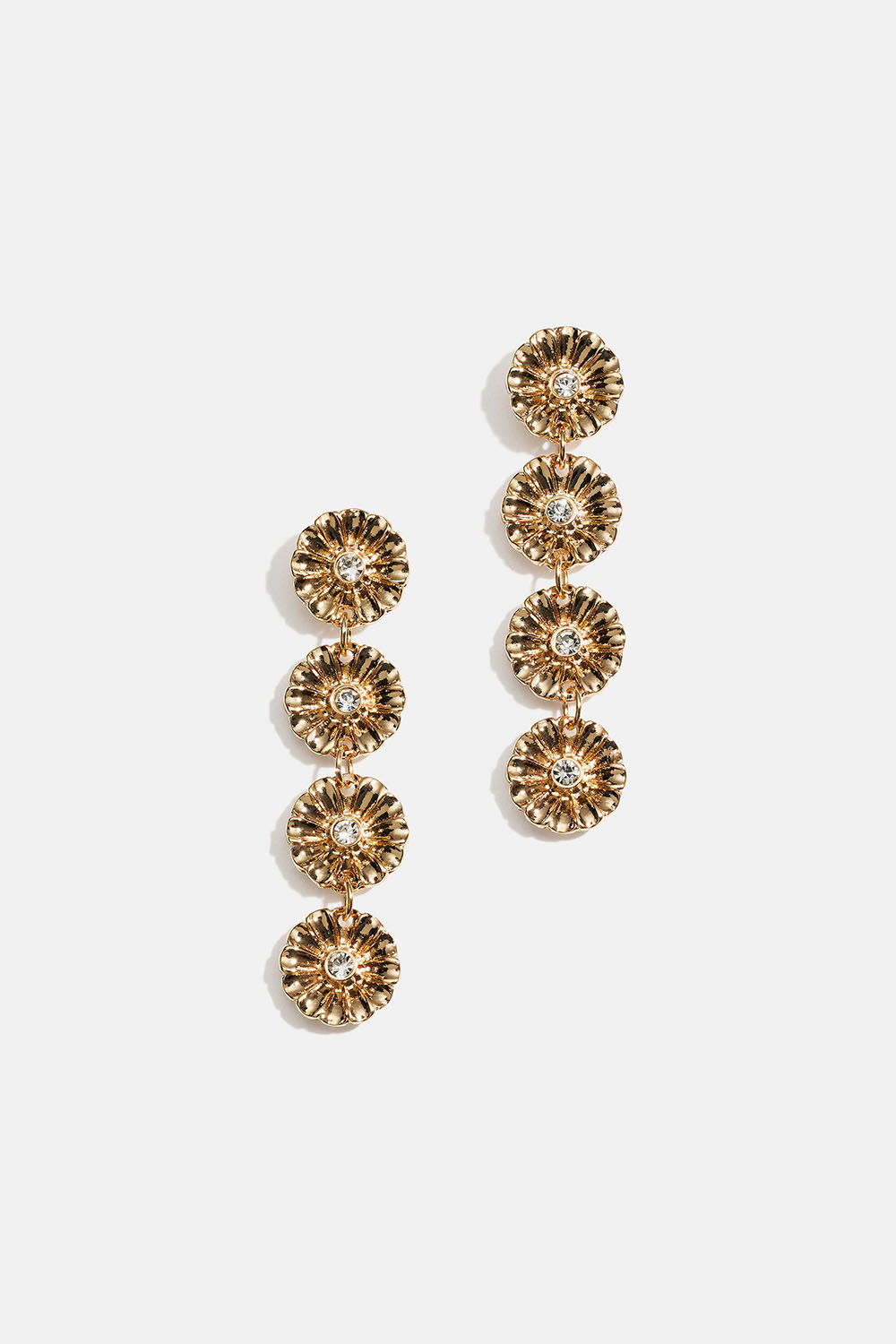 Pitkät kullanväriset metallikorvakorut, joissa on riippuvia pyöreitä kukkia ja keskellä lasikiviä.