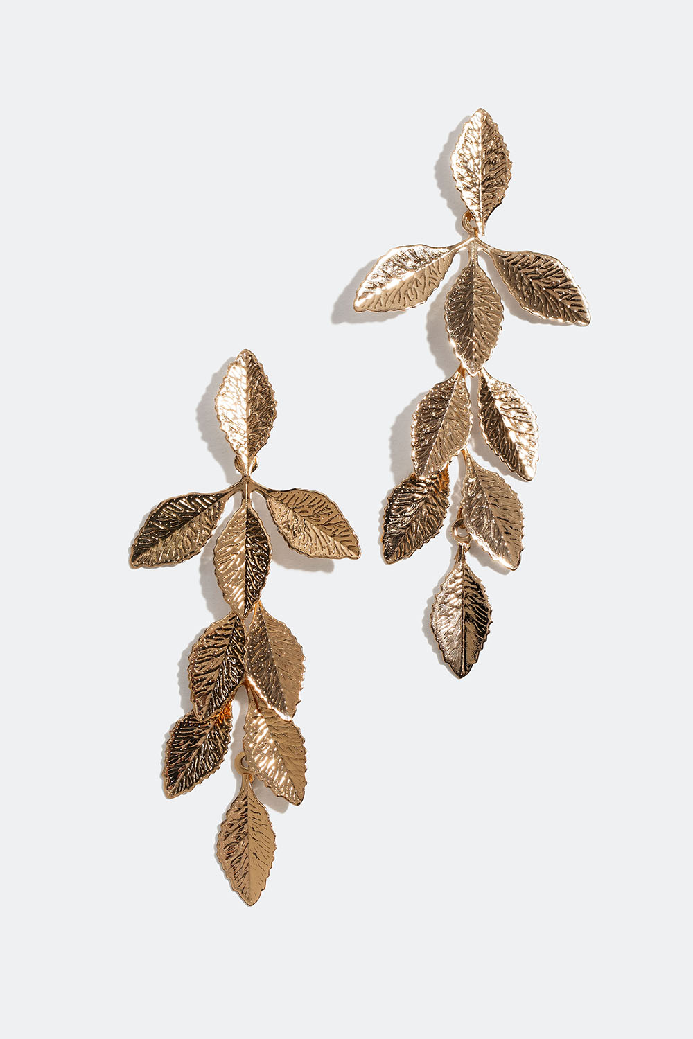 Pitkät kullanväriset korvakorut, joissa lehtiä