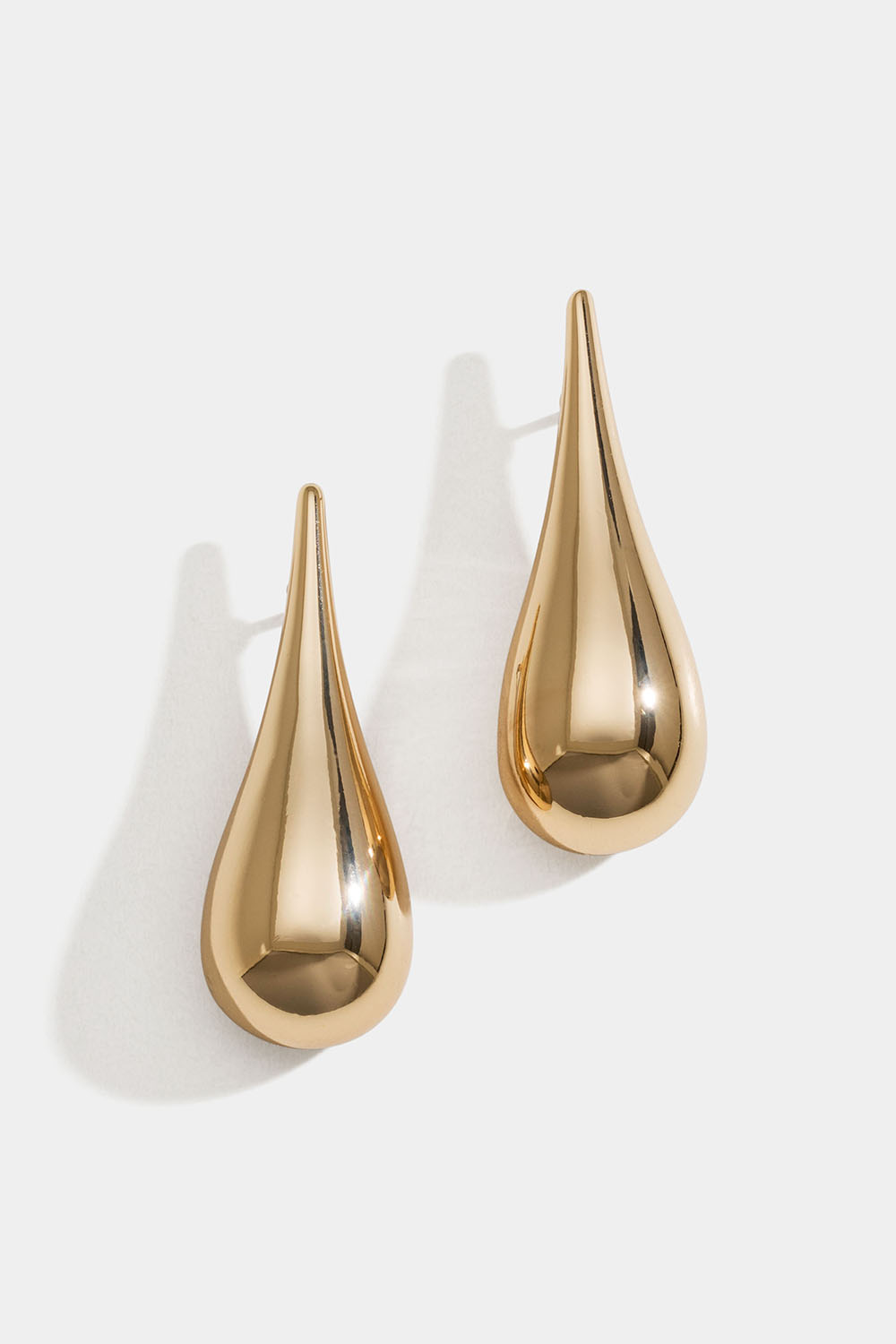 Pitkät kullanväriset metallikorvakorut, jotka ovat pisaranmuotoiset.