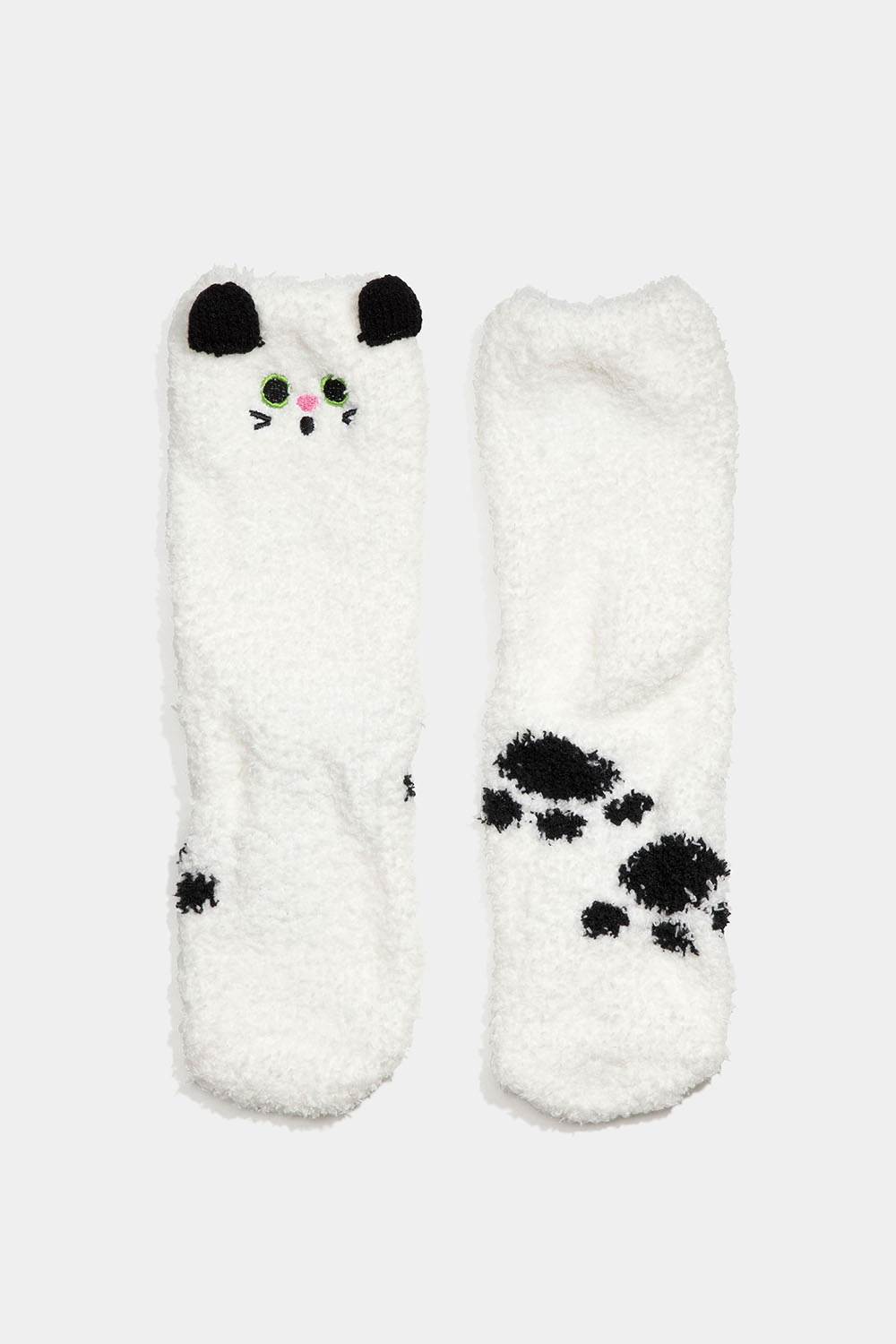 Pörröiset valkoiset sukat, joissa on kirjailtu kissa ja neulotut korvat. Lämpimät sukat, jotka sopivat kaikille.