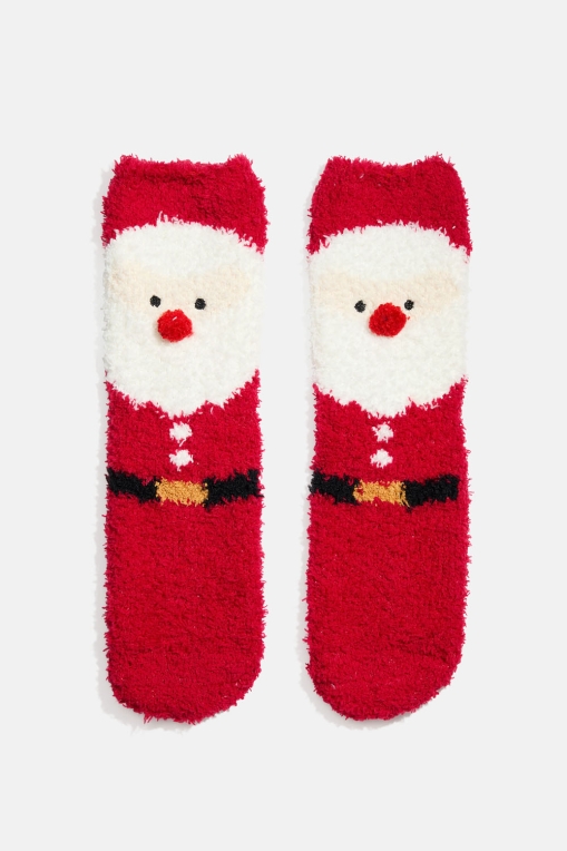Pörröiset sukat, joissa on jtonttu koristeena. Lämpimät sukat, jotka sopivat kaikille.