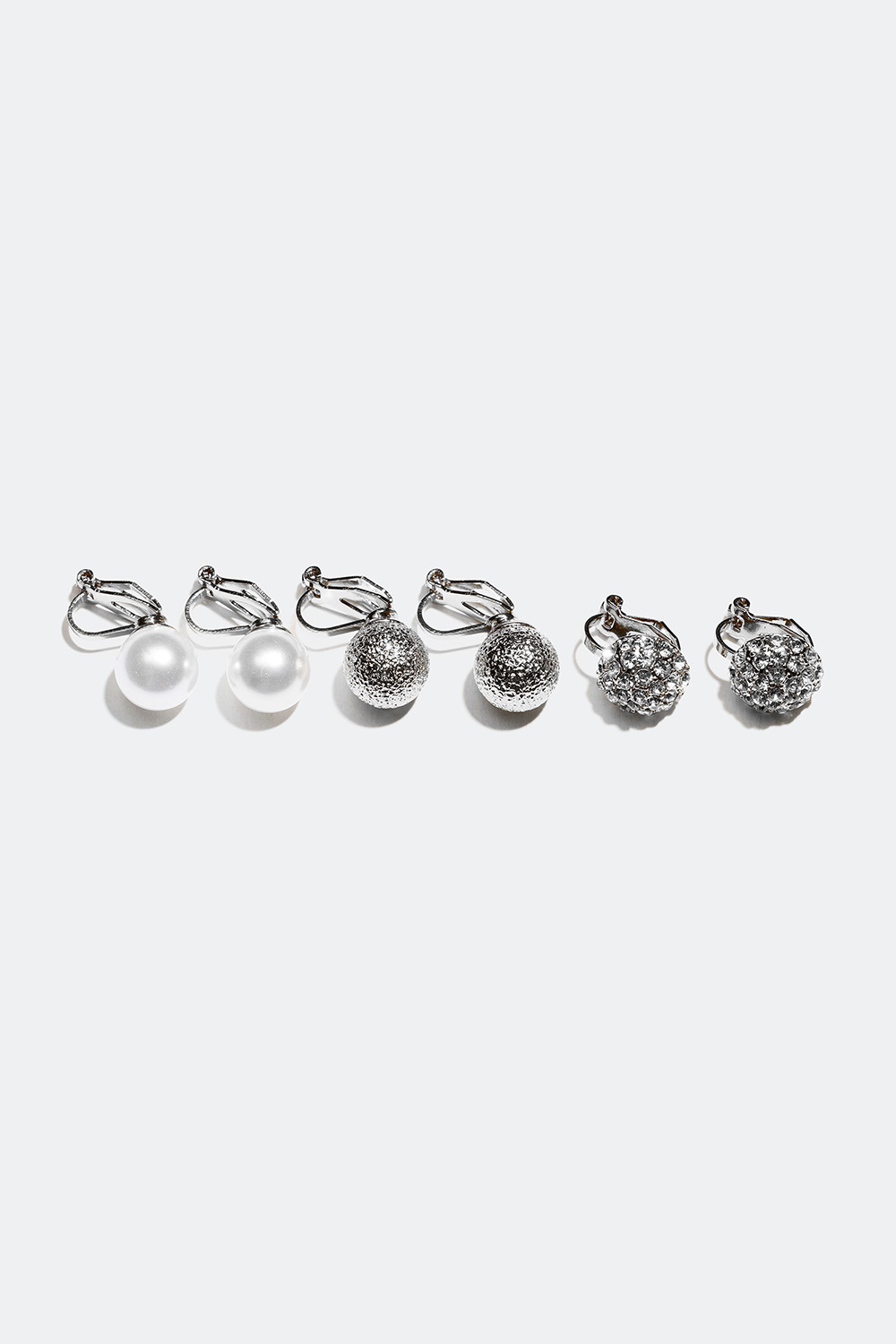 Klipsikorvakorut, 3 paria - Pakkauksessa on kolme erilaista paria pyöreitä klipsikorvakoruja. Yksi pari on koristeltu pienillä strassikivillä, yksi pari muovisilla helmillä ja yksi pari on kuvioitua metallia. Korvakorujen käyttö ei vaadi korvareikiä.