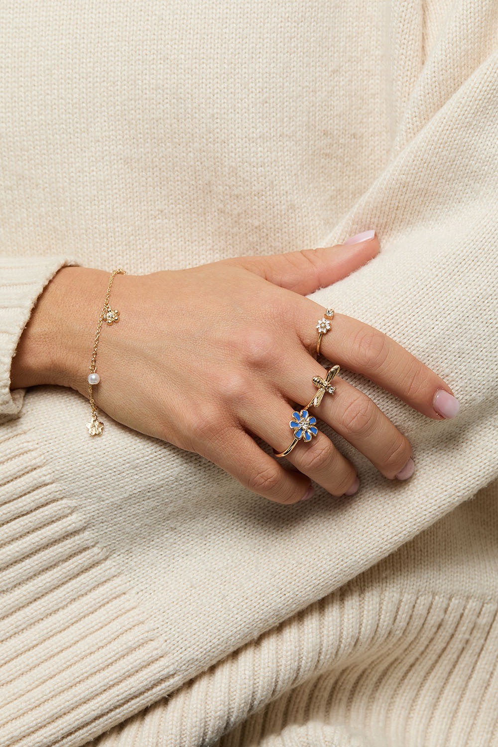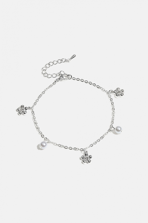 Metallinen ranneketju, jossa pieniä helmi- ja kukkariipuksia sekä kimaltavia lasikiviä.
