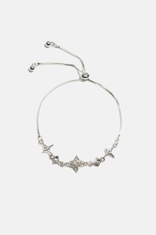 Rannekoru, jossa on ohut ketju koristeltuna tähdillä ja pienillä lasikivillä. Ketjun pituus on säädettävissä kumilla päällystetyn hopeahelmen avulla.