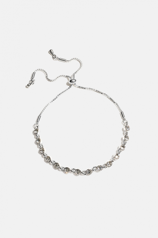 Metallinen rannekoru, jonka ohut ketju on koristeltu pienillä pyöreillä lasikivillä. Ketjun pituus on säädettävissä kumilla päällystetyn kultahelmen avulla.