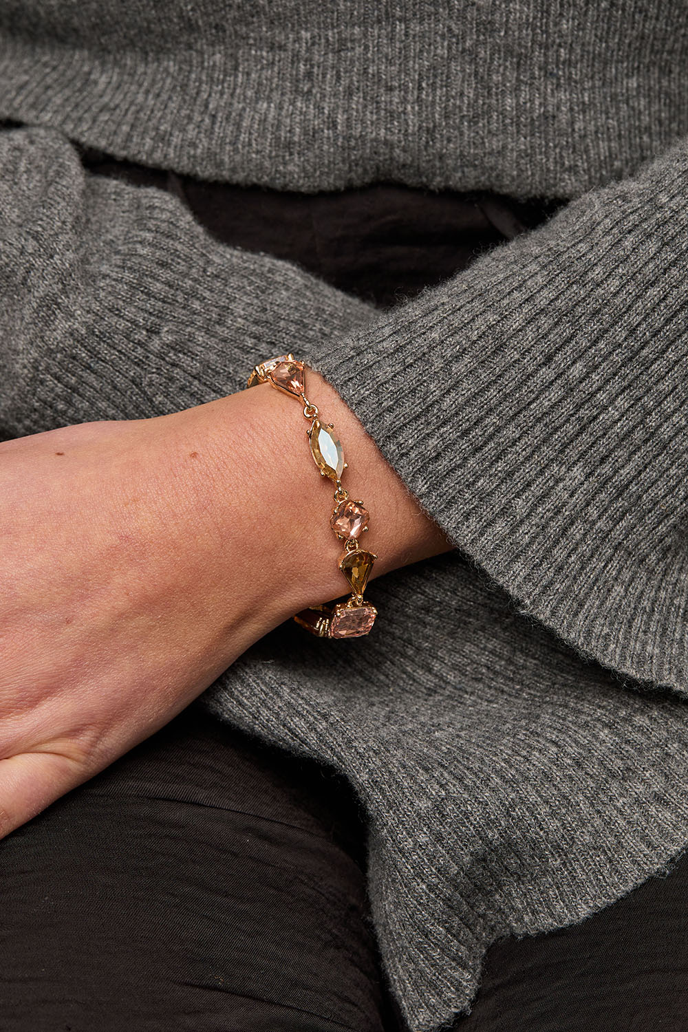 Kullanvärinen rannekoru, jossa on erimuotoisia vaaleanpunaisia, punaisia ja beigejä lasikiviä.