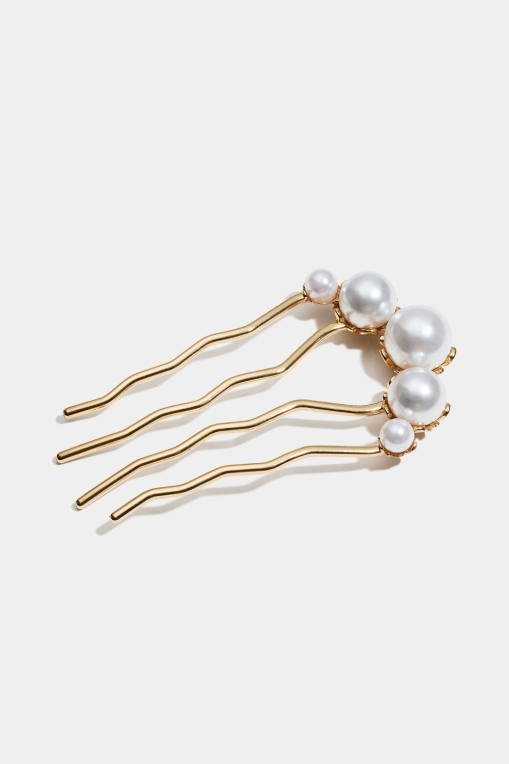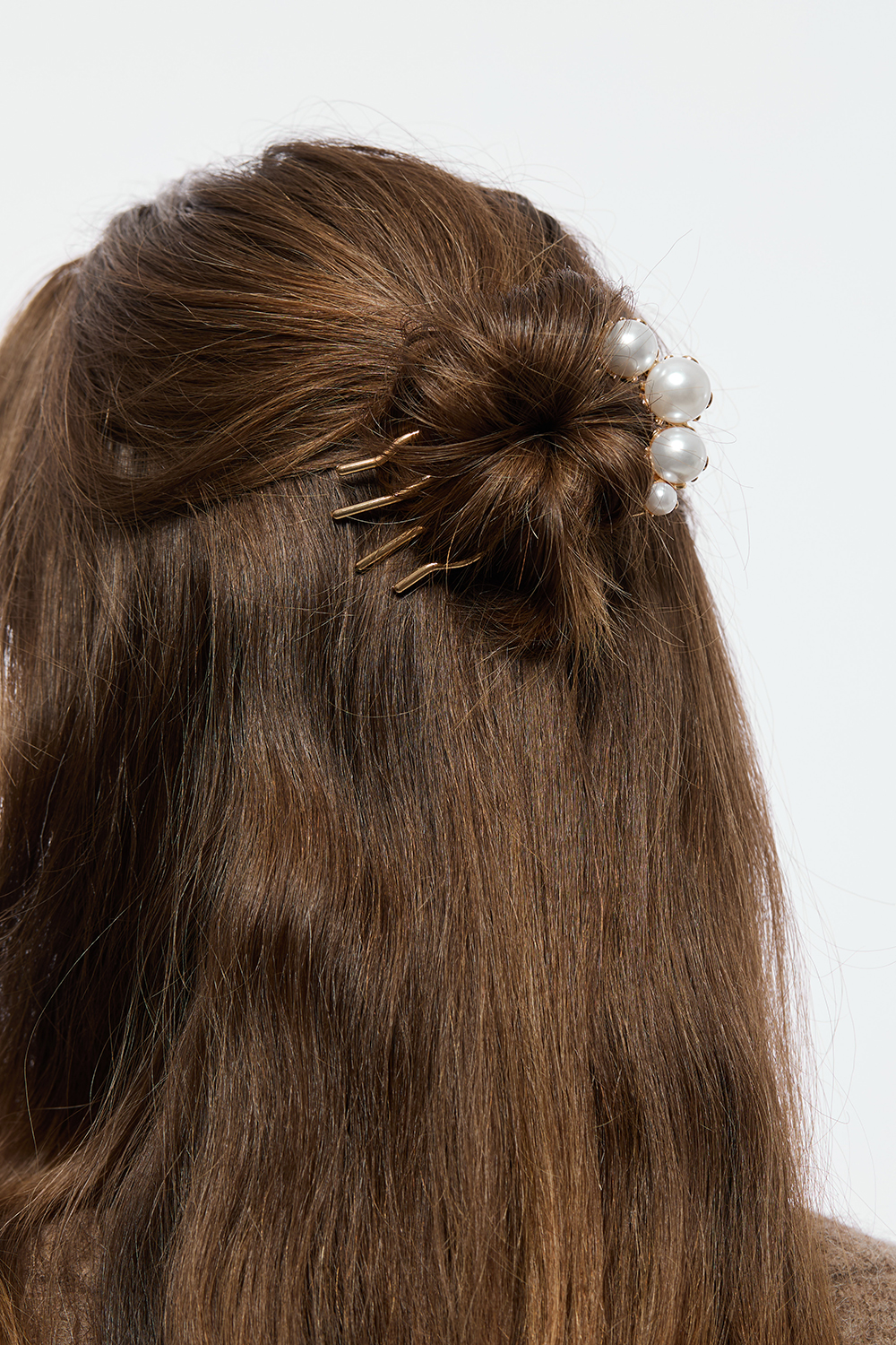 Ranskalainen hiusneula, jossa on neljä piikkiä, koristeltu erikokoisilla valkoisilla helmillä.