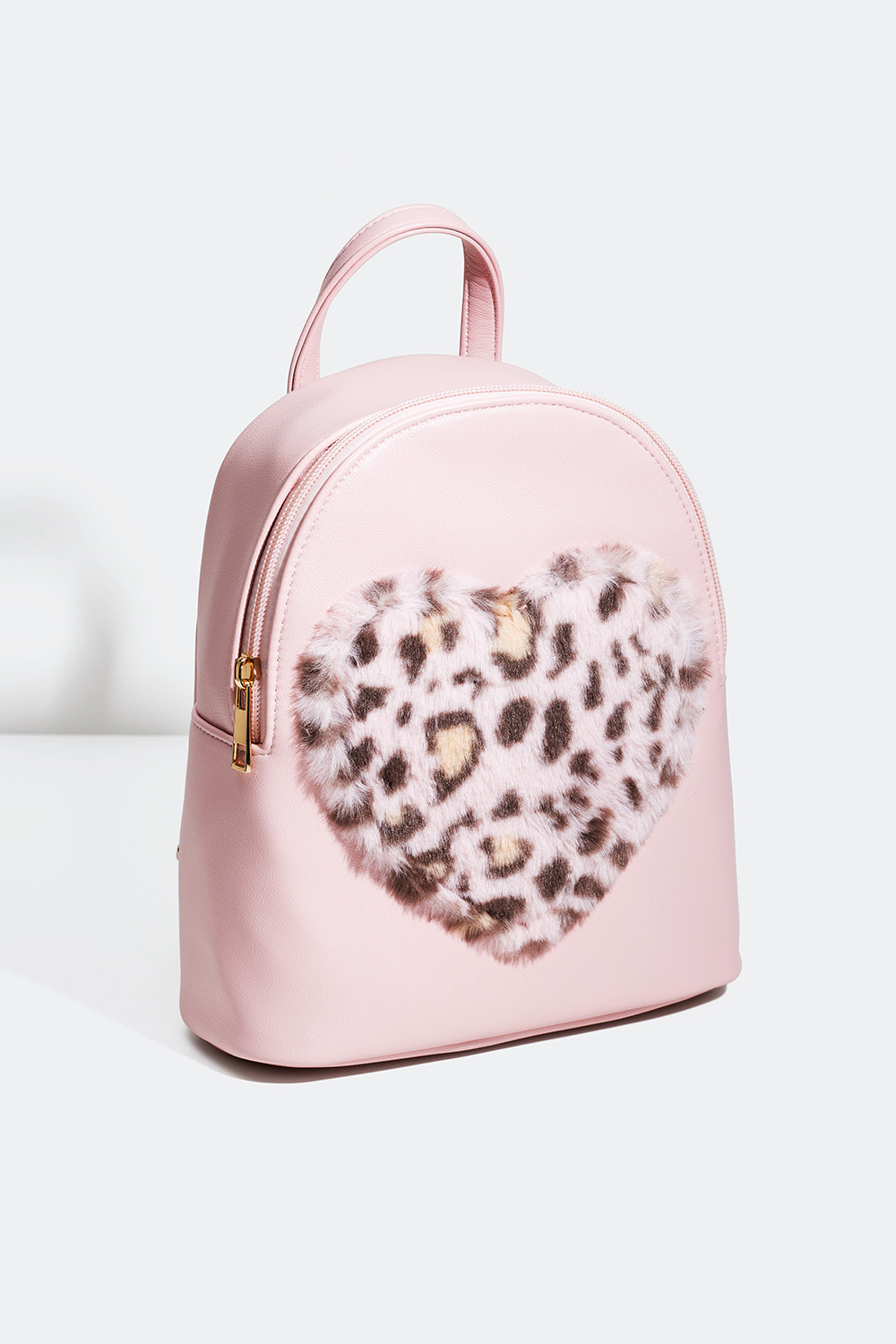 Reppu pehmeällä sydämellä - Pienempi tekonahkainen selkäreppu lapsille. Selkärepun sydänkoristelu pehmeästä tekoturkiksesta, repussa on vetoketjukiinnitys, olkahihnat ja kantokahva.
