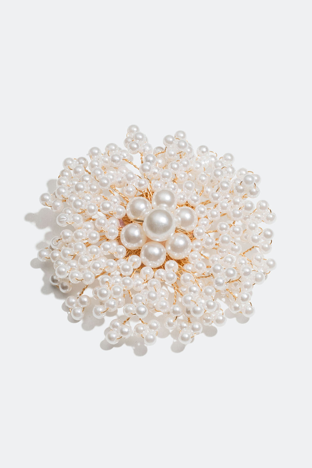 Koristeellinen rintaneula kullanvärisestä metallista, jossa on suuria ja pieniä helmiä.