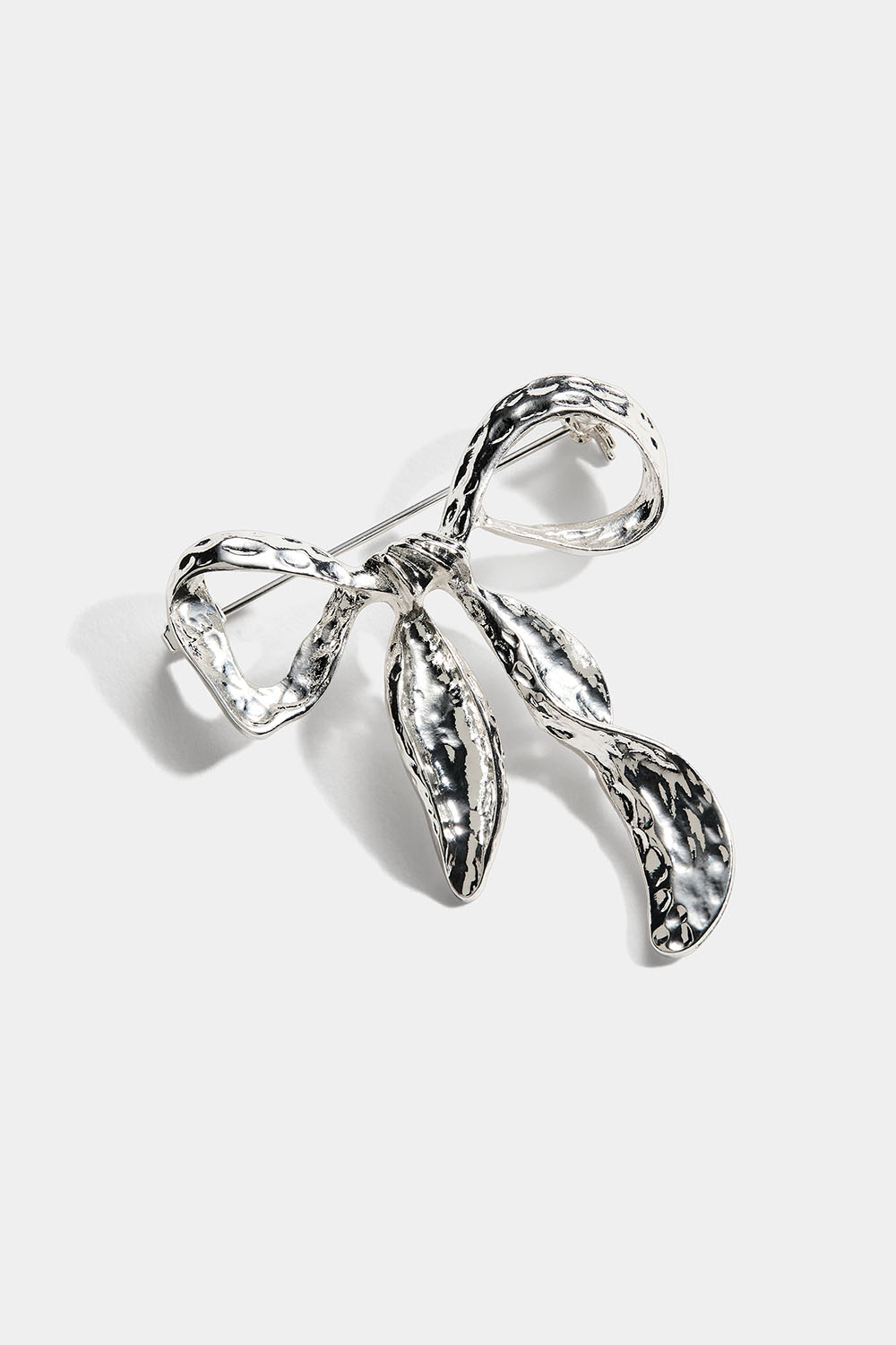 Hopeanvärinen metallirintakoru, jossa on vasaroitu rusetti. Kiinnitetään klassisella rintaneulalla.