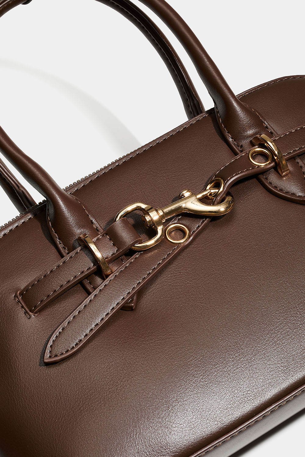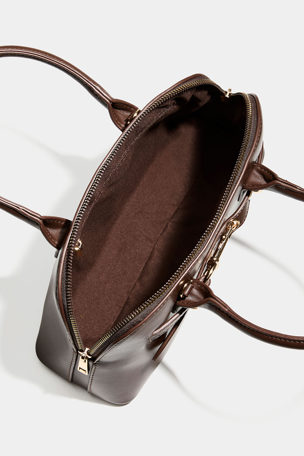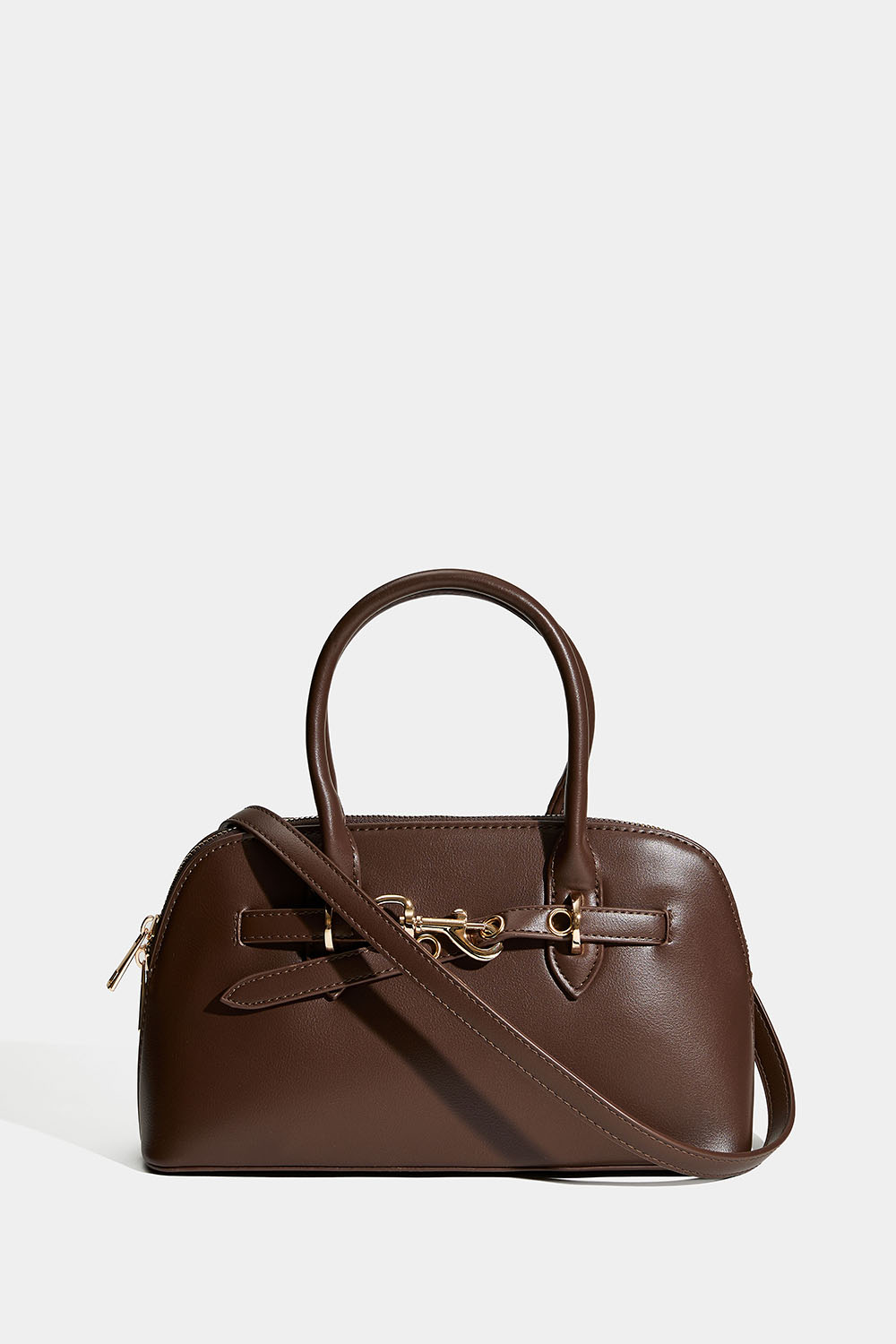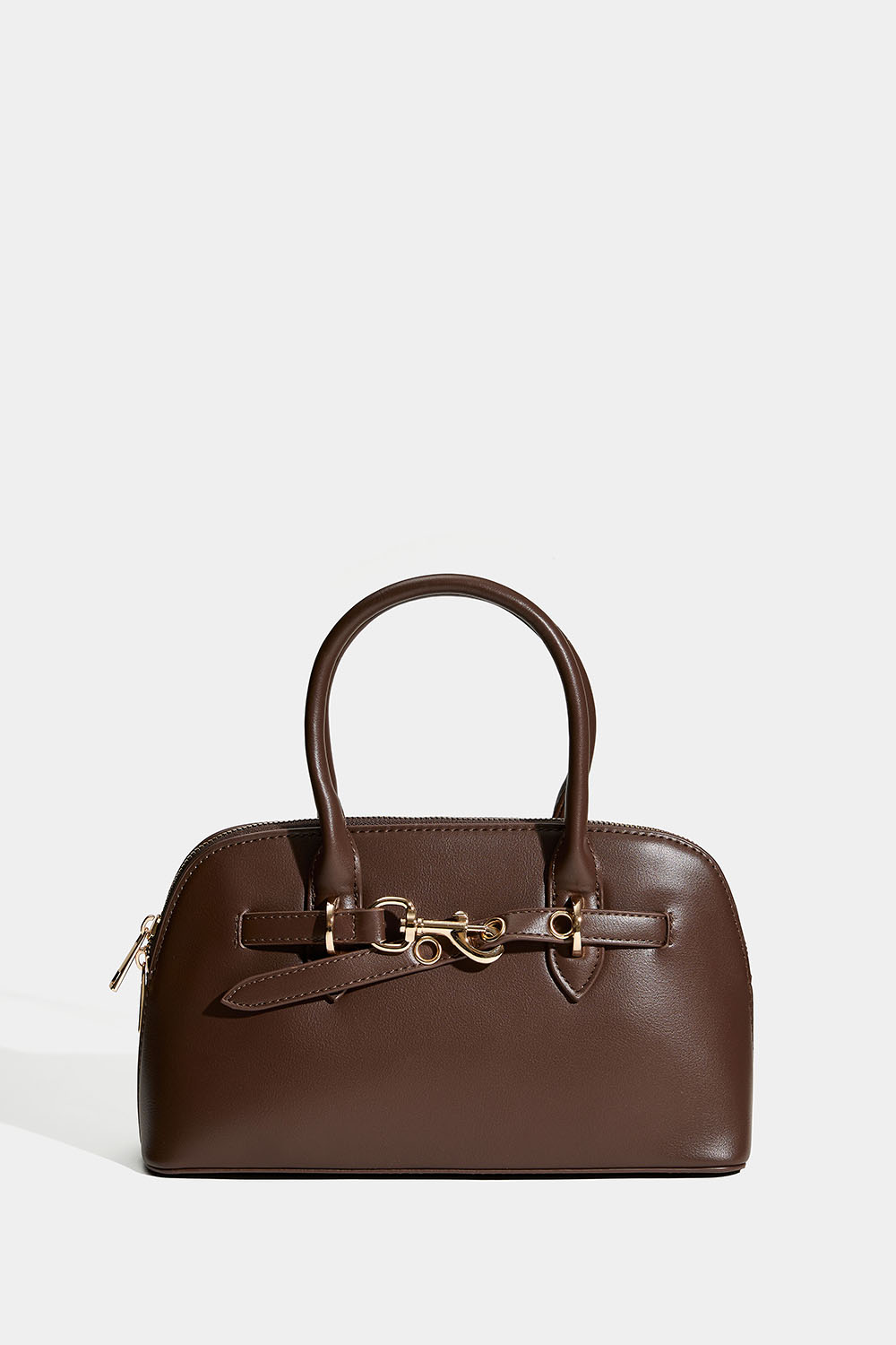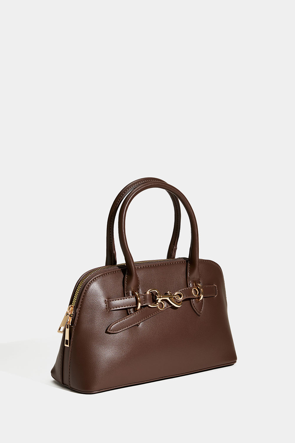 Ruskea käsilaukku, jossa on kaksinkertaiset kantokahvat. Tyylikäs laukku, jossa on olkahihna ja kullanvärinen metallilukkoyksityiskohta. Päätasku suljetaan vetoketjulla, ja sisällä on myös pienempi tasku. Mukana irrotettava olkahihna.