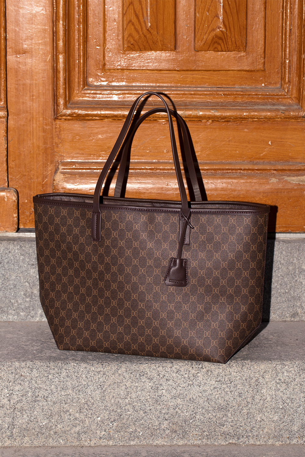 Suuri ruskea tote-laukku painetulla Don Donna -logolla. Tyylikäs, kapeilla kahvoilla varustettu käsilaukku, jossa yhdistyvät muoti ja toimivuus. Laukussa on avaimenperä, yksi iso tasku ja kaksi pienempää sisätaskua. Täydellinen arkilaukku ja asuste työhön sekä kouluun. Runsaasti tilaa ja älykkäitä säilytysratkaisuja.