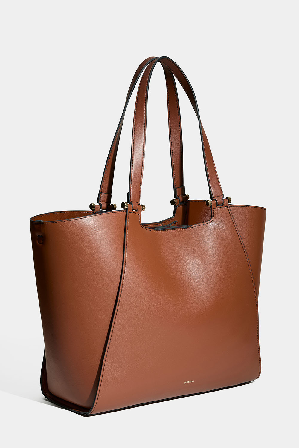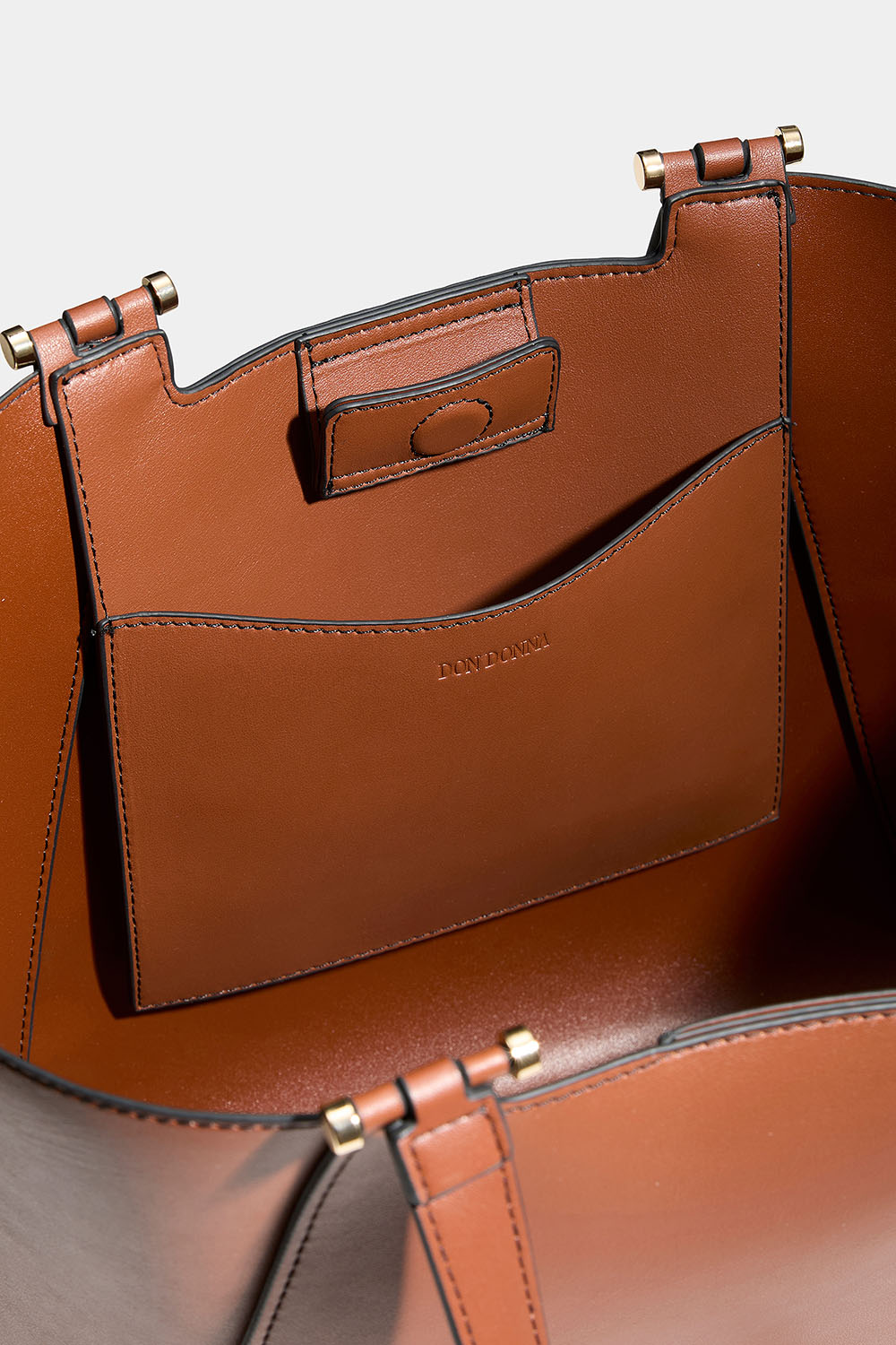 Ruskea Don donna -kassi tekonahasta. Tyylikäs laukku, jossa on kaksinkertaiset kapeat kahvat ja irrotettava pidempi olkahihna. Laukussa on suuri lokero, joten voit halutessasi napittaa laukun sivut kapeammiksi.