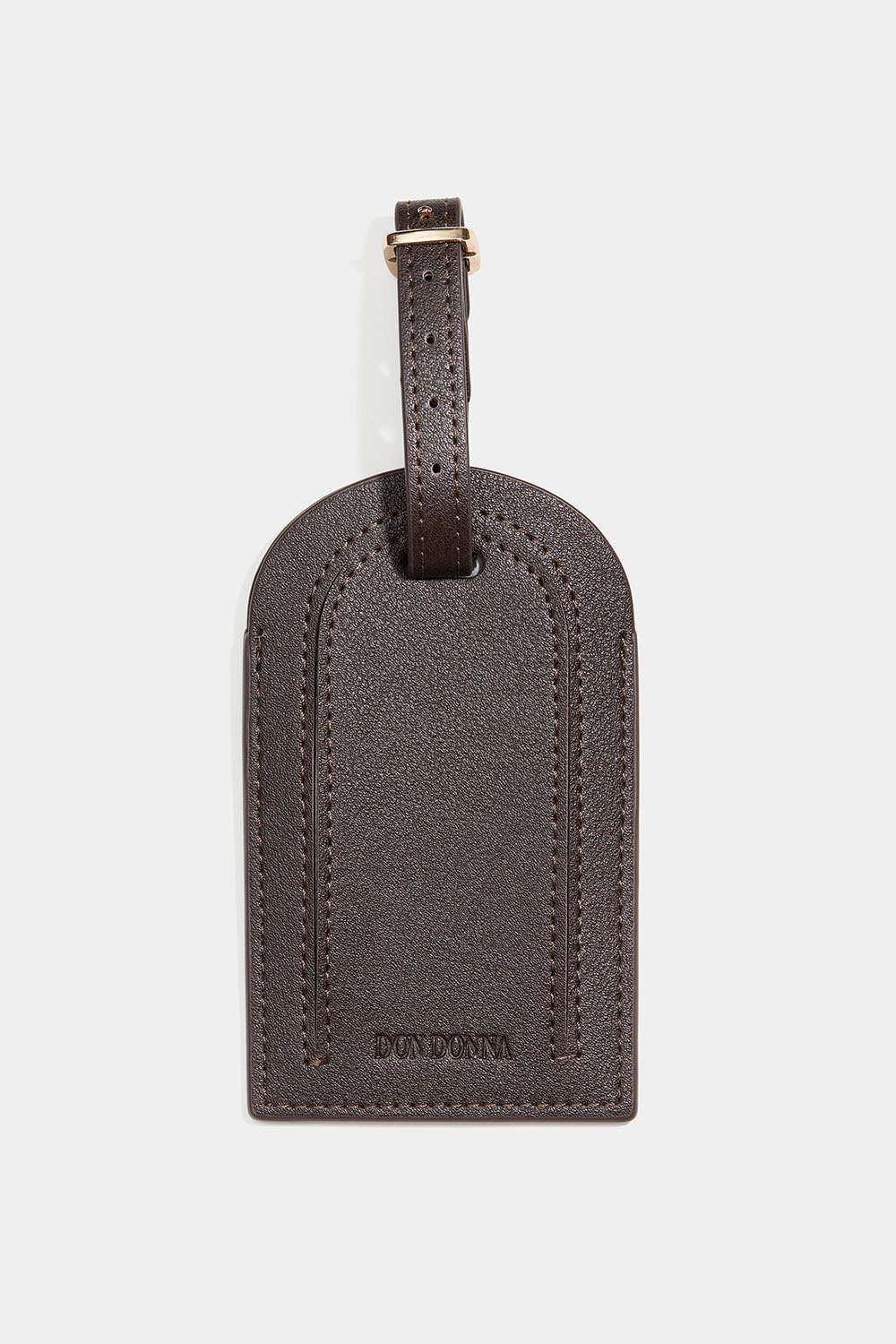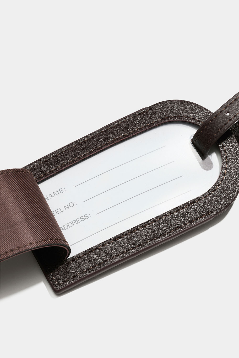 Ruskea keinonahkainen matkalaukkulappu, joka kiinnitetään laukkuun. Voit kirjoittaa tietosi lapun osoitelappuun.