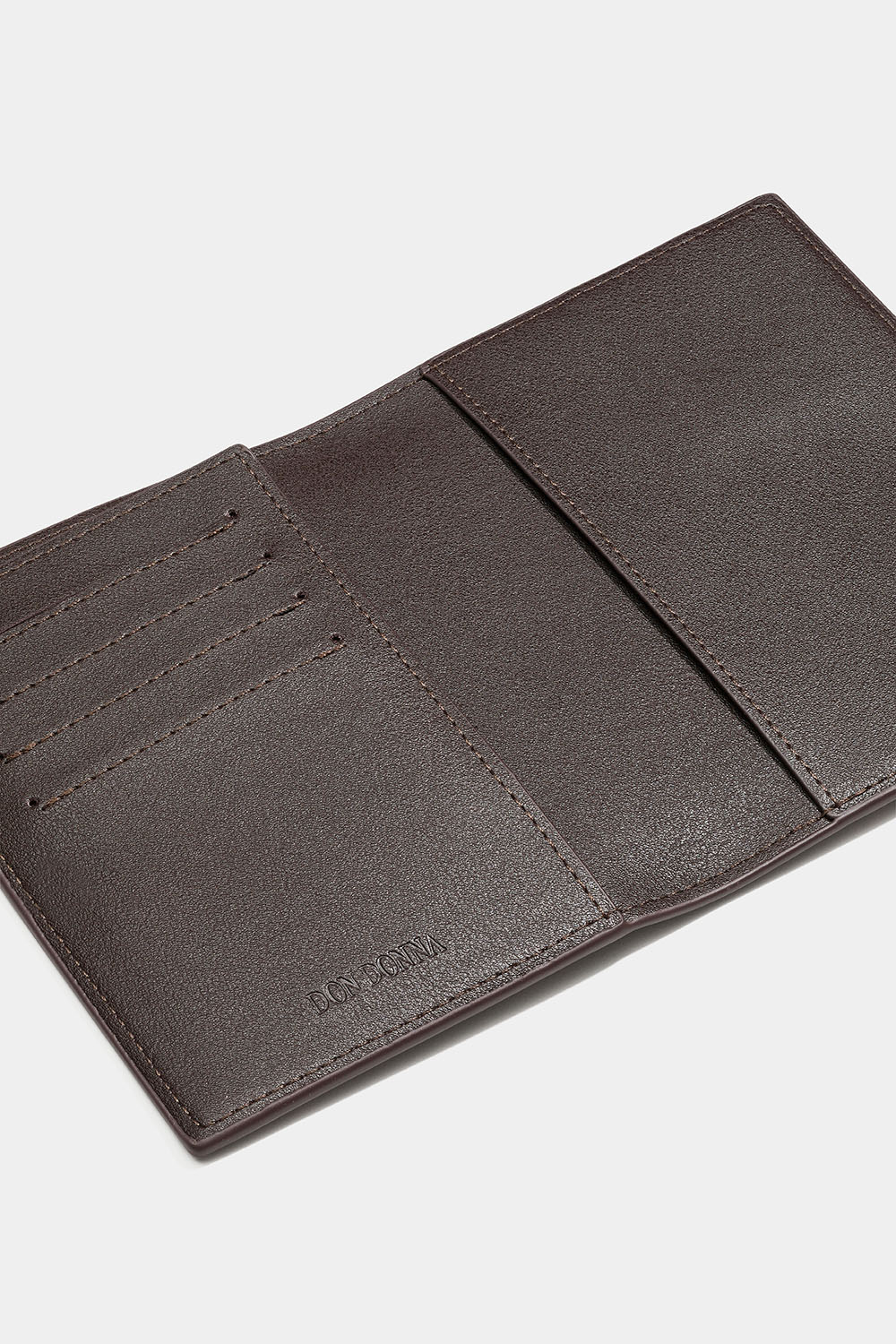 Ruskea passikotelo keinonahkaa, jossa on DD-kuvio. Sisäpuolella on myös neljä korttipaikkaa.