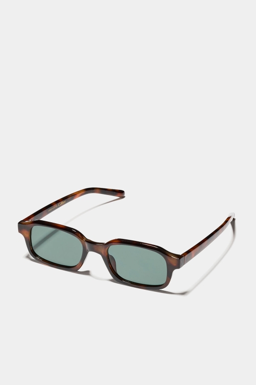 Ruskeat tyylikkäät aurinkolasit, joissa on kapeat suorakulmaiset kehykset.