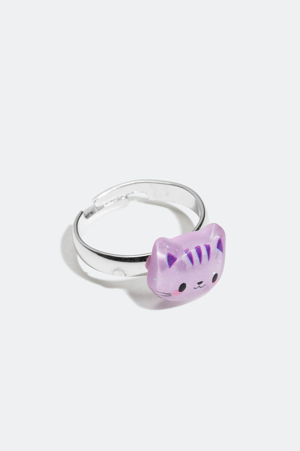 Lasten säädettävä sormus, jossa on violetti kissa.